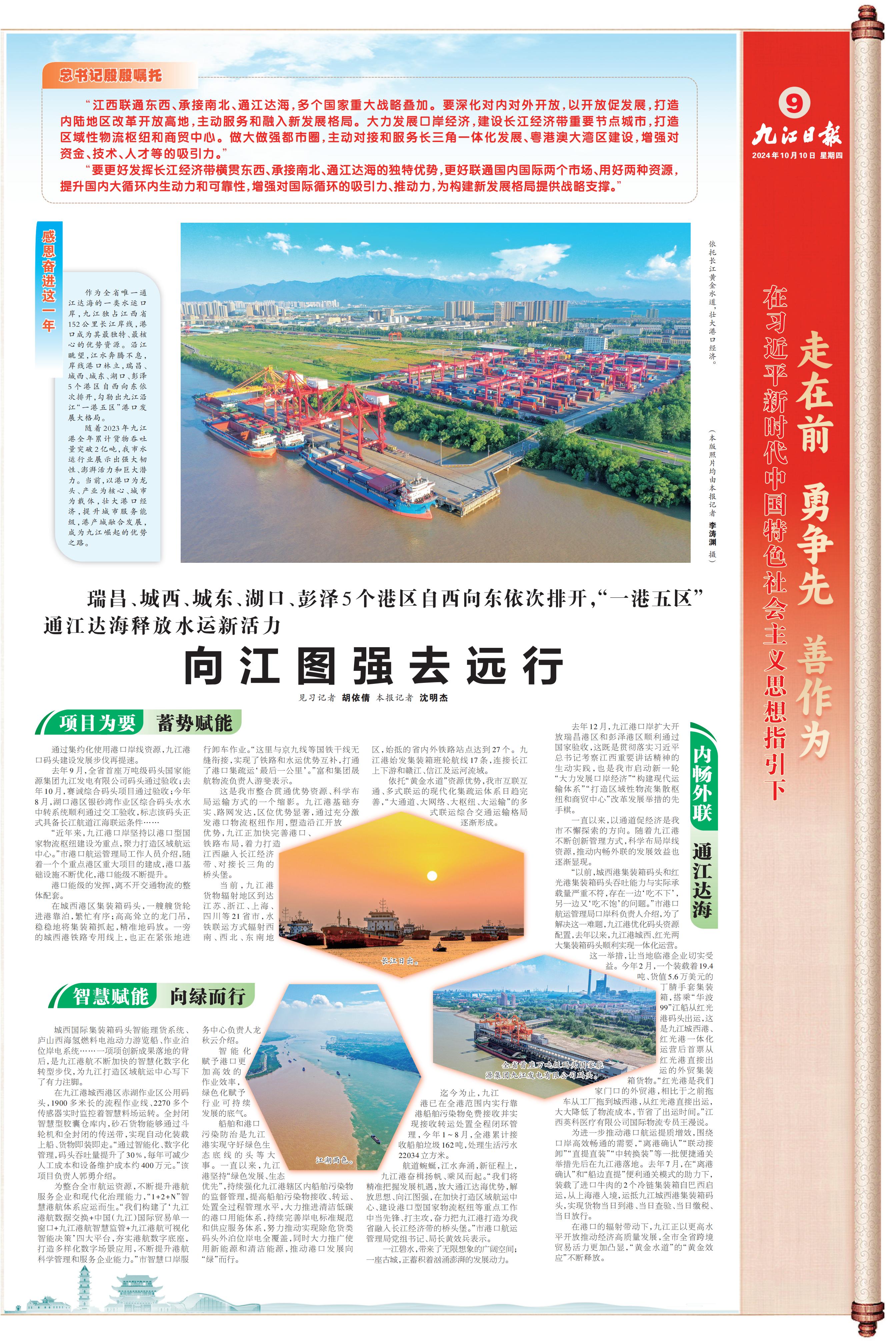 航道蜿蜒,江水奔涌,新征程上,九江港奋楫扬帆、乘风而起。“我们将精准把握发展机遇,放大通江达海优势,解放思想、向江图强,在加快打造区域航运中心、建设港口型国家物流枢纽等重点工作中当先锋、打主攻,奋力把九江港打造为我省融入长江经济带的桥头堡。”市港口航运管理局党组书记、局长黄效兵表示。