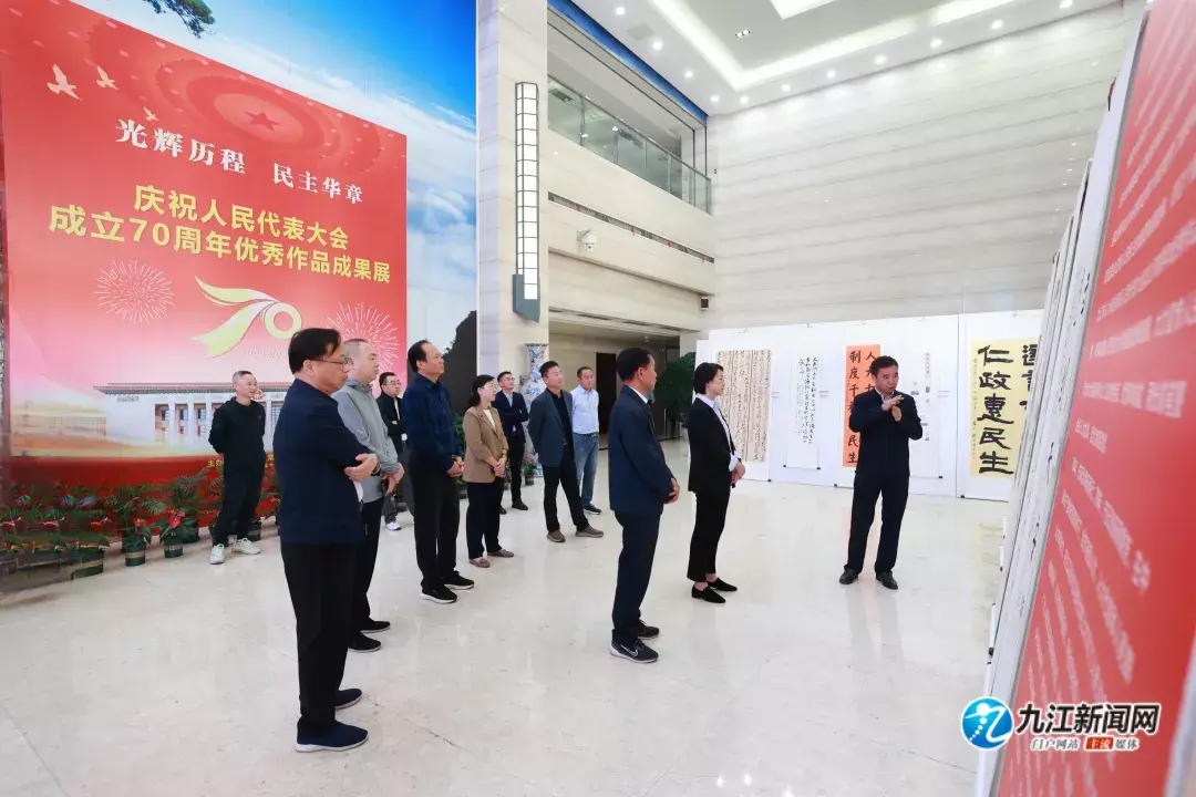 九江新闻网讯(九江日报全媒记者 黄梦如)墨海豪情展光辉历程,丹青溢彩绘民主华章。10月8日,我市庆祝人民代表大会成立70周年优秀作品成果展开展。市人大常委会主任廖奇志,市人大常委会副主任周美祥、杨鸿敏、肖立新、徐志鸿、胡迪,市人大常委会秘书长郭小云在市人大机关一楼大厅参观展览。