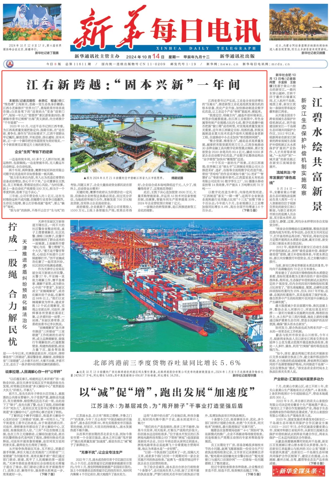 10月14日,《新华每日电讯》头版头条稿件《江右新跨越:“固本兴新”一年间》,大篇幅报道在“走在前、勇争先、善作为”的目标要求下,九江市干部群众牢记嘱托,解放思想、开拓进取,扬长避短、固本兴新,正一步一个脚印把宏伟蓝图变为美好现实,一个个新故事见证着这片土地的新变化。