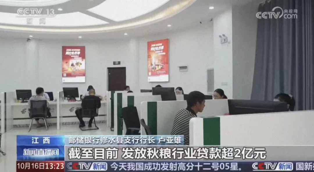10月16日,央视《新闻直播间》栏目播出《今天是世界粮食日 超2000万吨 秋粮收购进行时》,报道邮储银行修水县支行优化金融服务,开通秋粮绿色通道,保障秋粮贷款及时、足额发放。