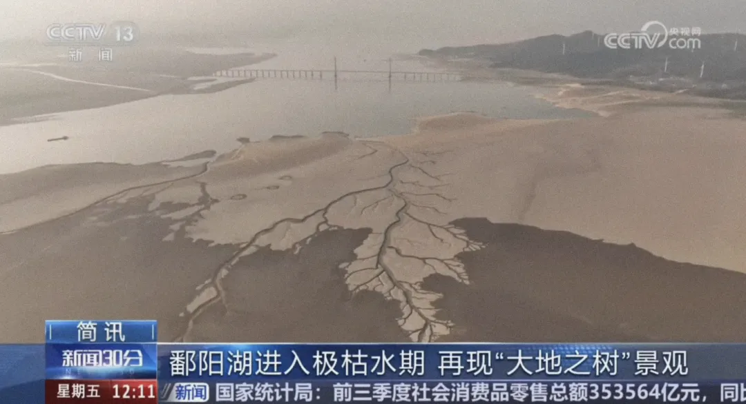 10月18日,央视《新闻30分》栏目播出《鄱阳湖进入极枯水位 再现“大地之树”景观》,报道鄱阳湖进入极枯水位后,都昌段水域滩涂在水流分支的冲刷下,呈现出栩栩如生的“大地之树”景观,从空中俯瞰,非常震撼。