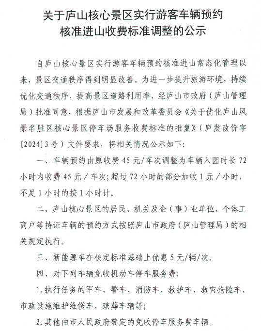 注意啦!关于庐山核心景区实行游客车辆预约核准进山收费标准调整的公示