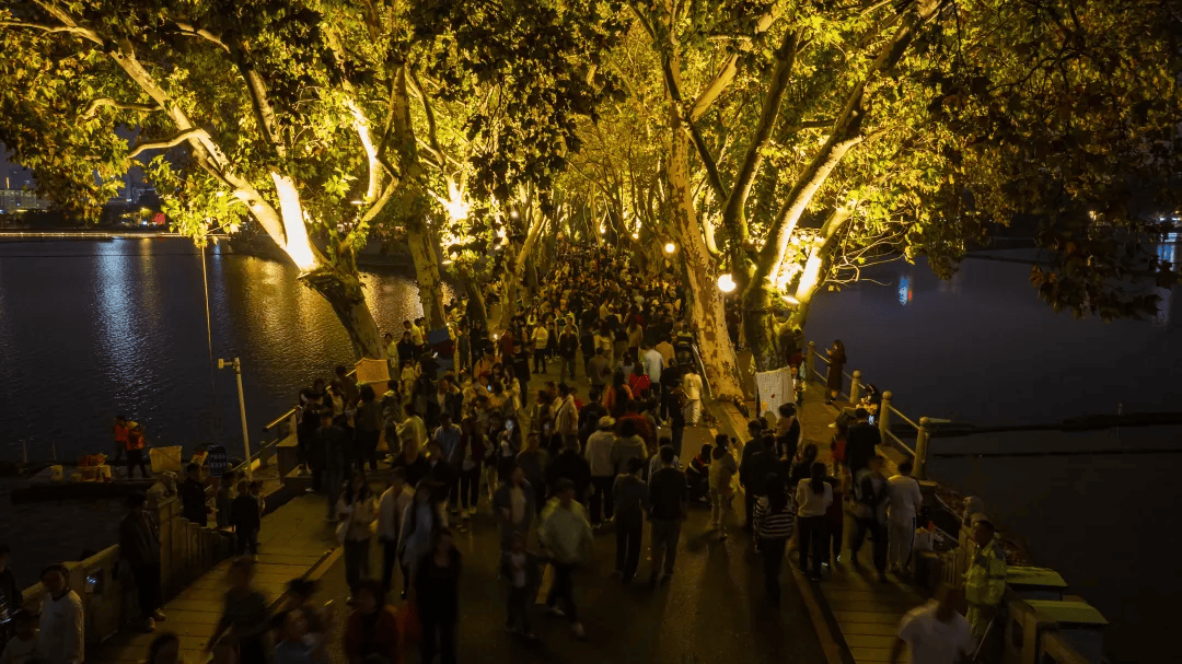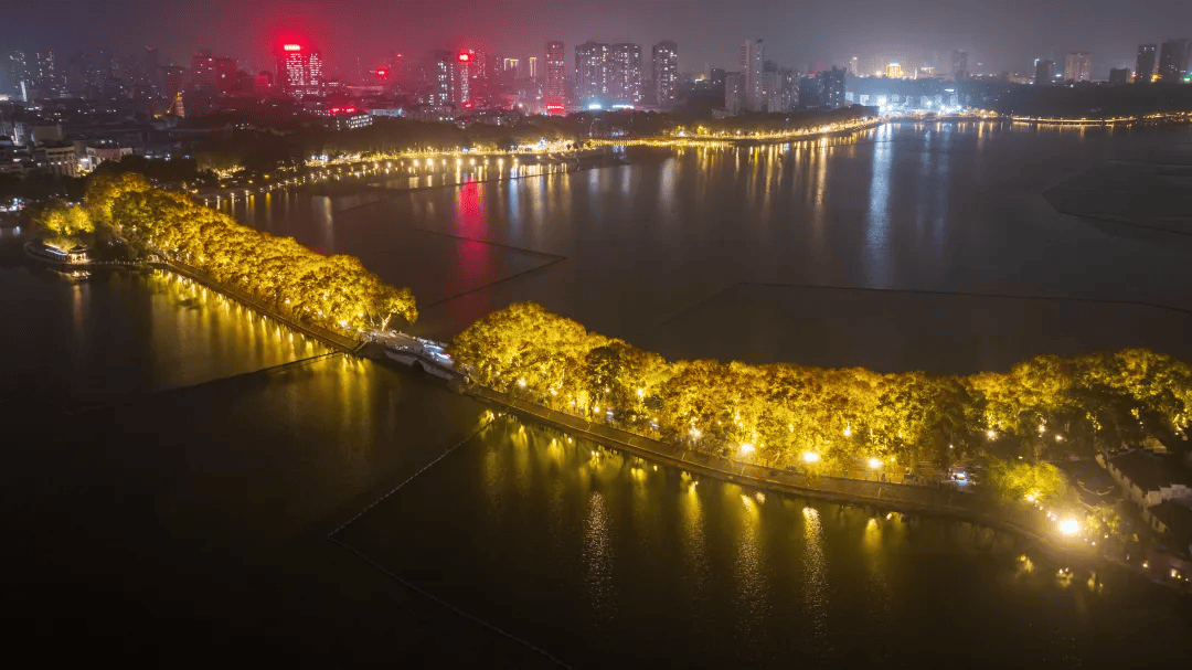 连同堤上的高大梧桐璀璨灯光,