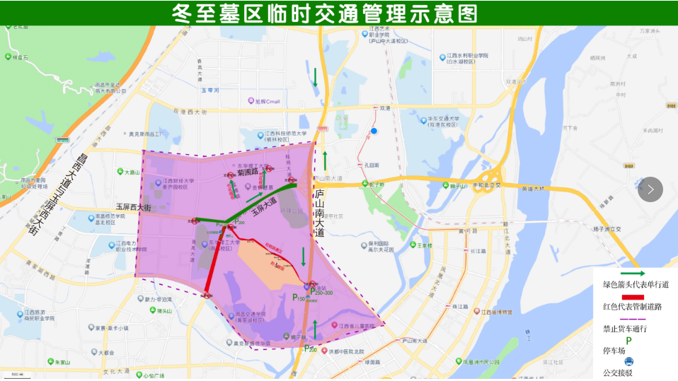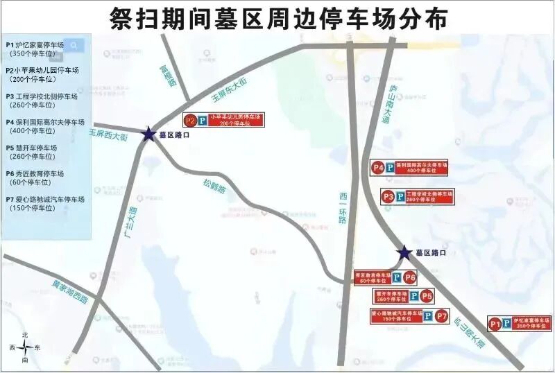 3.墓区内禁止一切车辆停放。庐山南大道的瀛上路口、庐山南大道的玉屏东大街路口、玉屏西大街的青岚大道口、广兰大道的黄家湖东路口100米内禁止机动车停放。