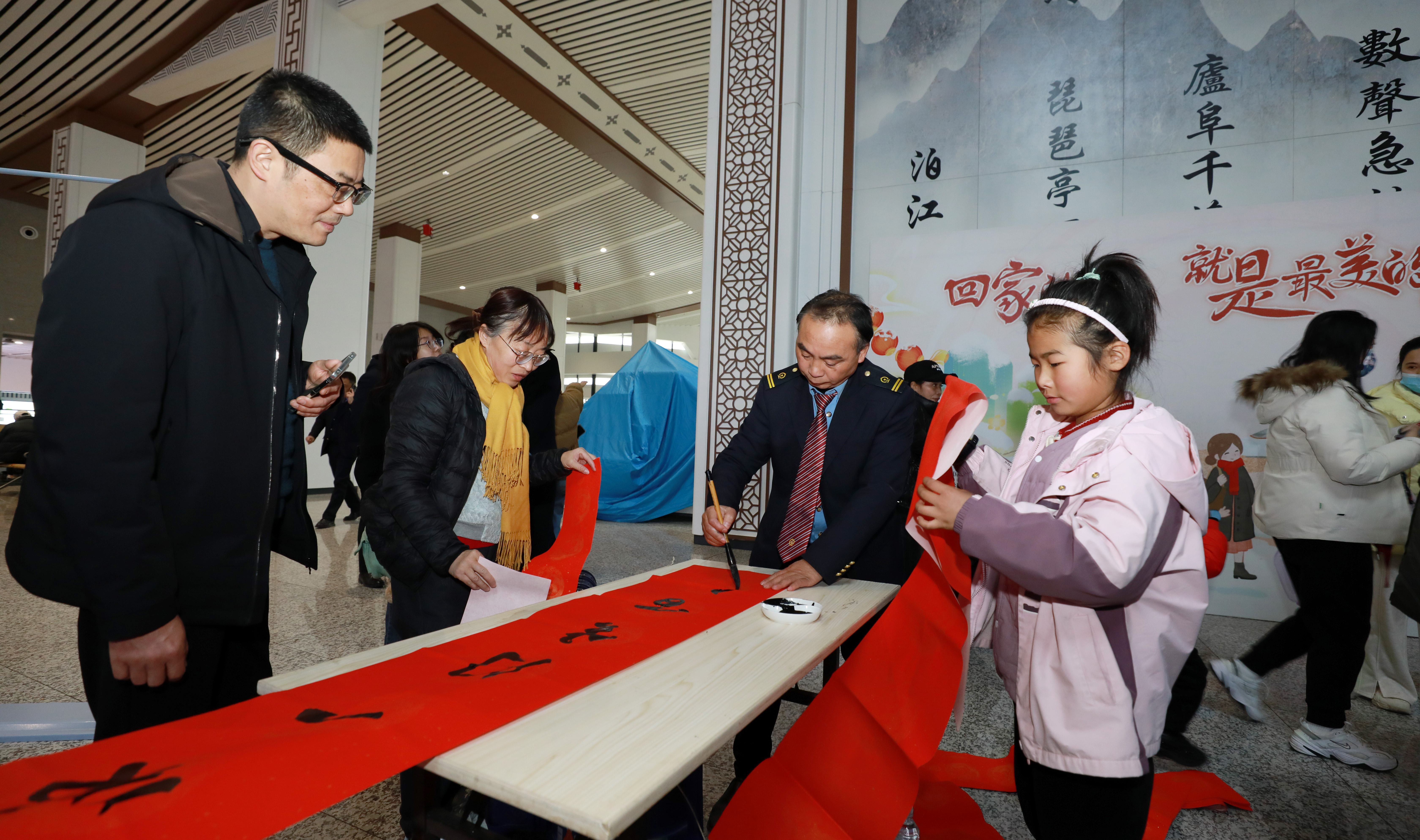 免费为旅客送春联。(九江日报全媒记者 孙昌模 摄)