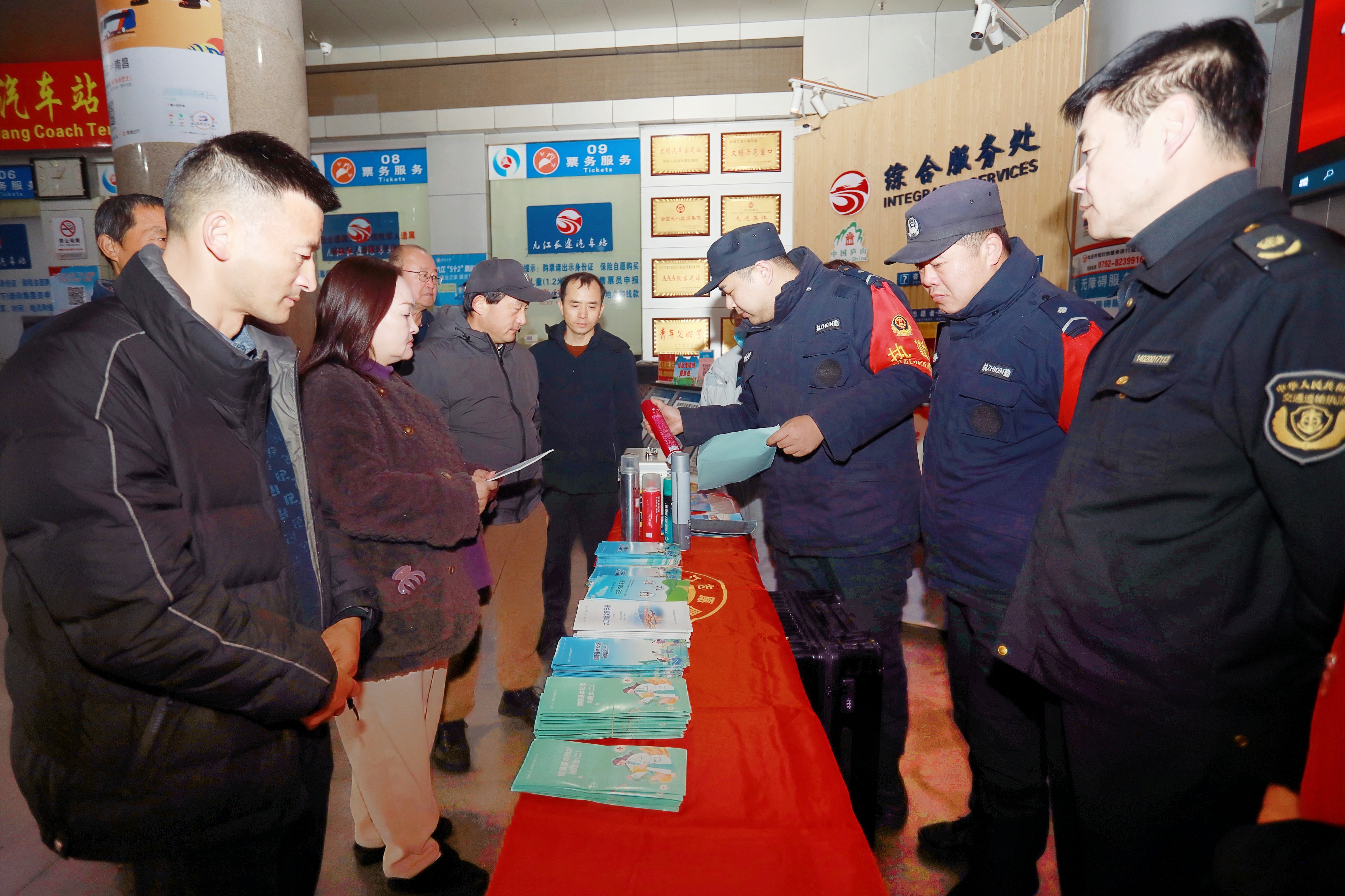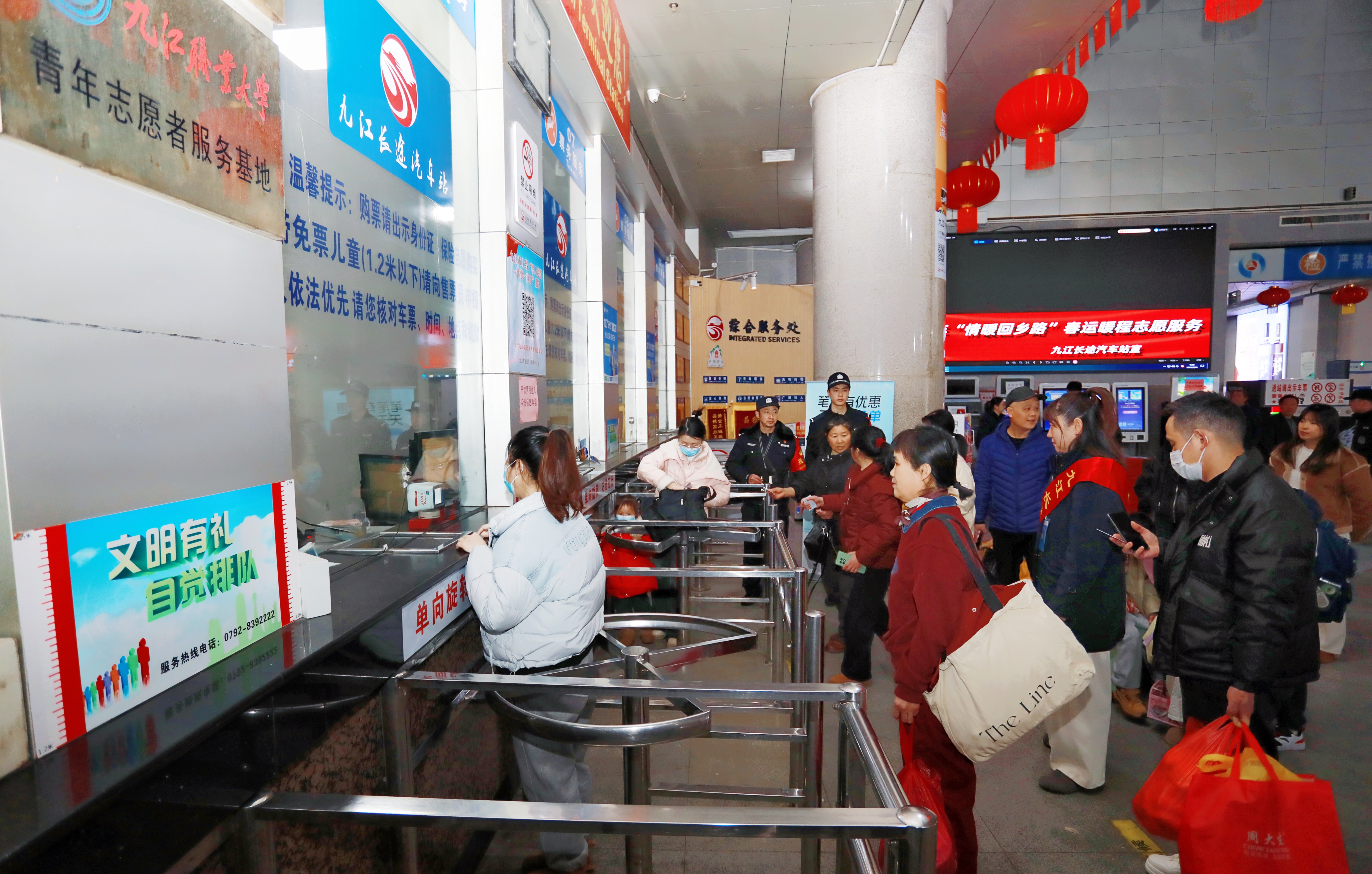 在九江长途汽车站,一场充满温情的“情暖回乡路”春运暖程志愿服务活动火热开展。在车站大厅,志愿者们积极为旅客提供购票、乘车咨询等服务,并向过往旅客发放《九江市民文明手册》《文明旅游》等宣传资料,倡导大家文明乘车,争做文明市民;驻站公安民警向旅客介绍“危险品”知识宣传,并现场展示违禁携带物品和发放宣传资料;学雷锋流动服务车现场为有需求的旅客免费发放热粥、姜茶、口罩等物品,努力为广大旅客营造一个温馨、便捷、安全的出行环境。