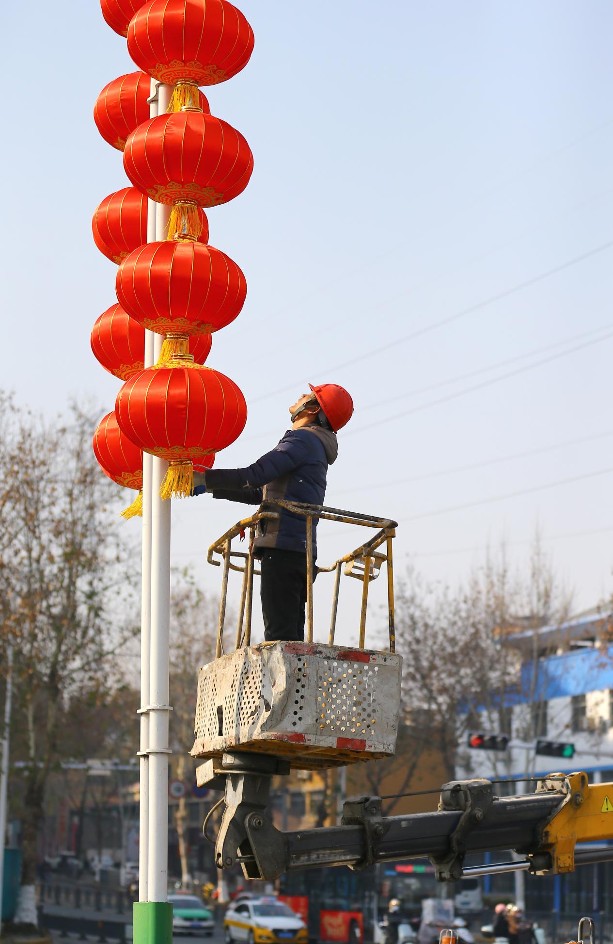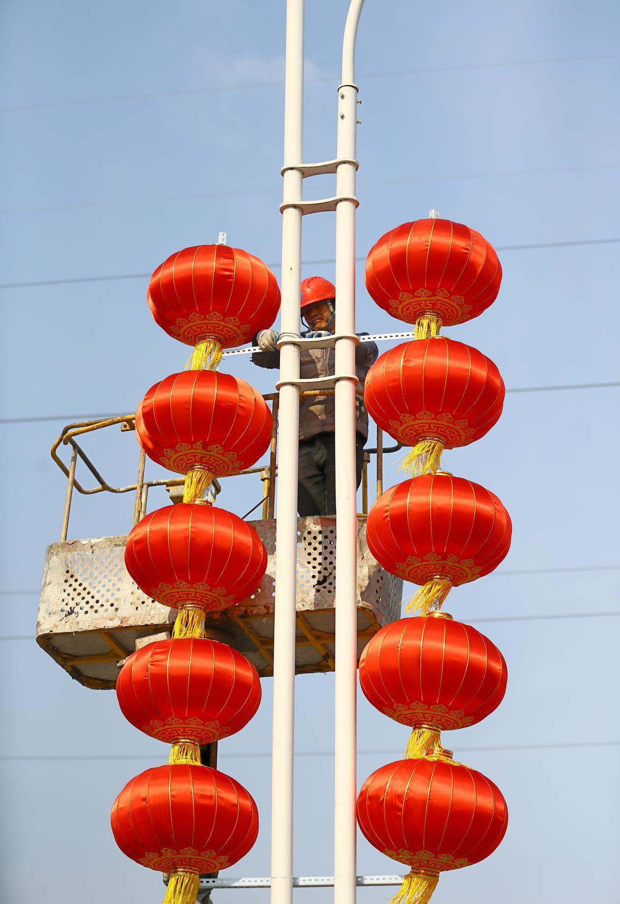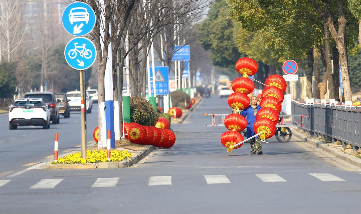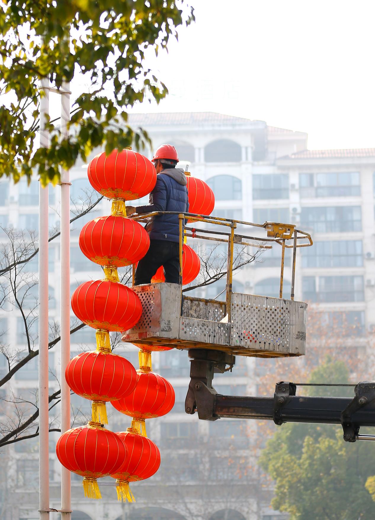 1月20日,庐山大道市政人员在行道旁悬挂灯笼。随着新春佳节的临近,我市主城区行道旁陆续挂起火红的灯笼,春节的氛围越来越浓。