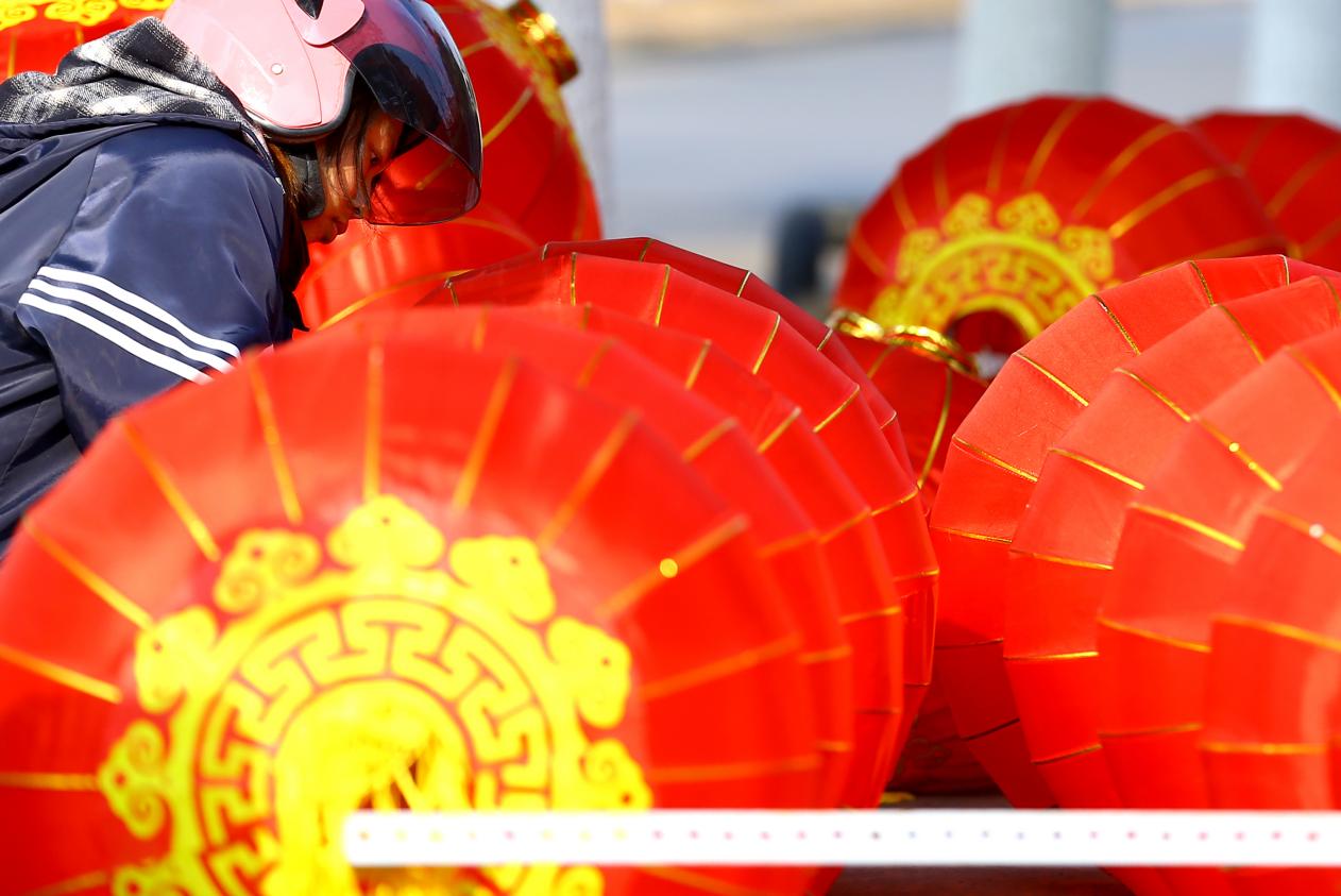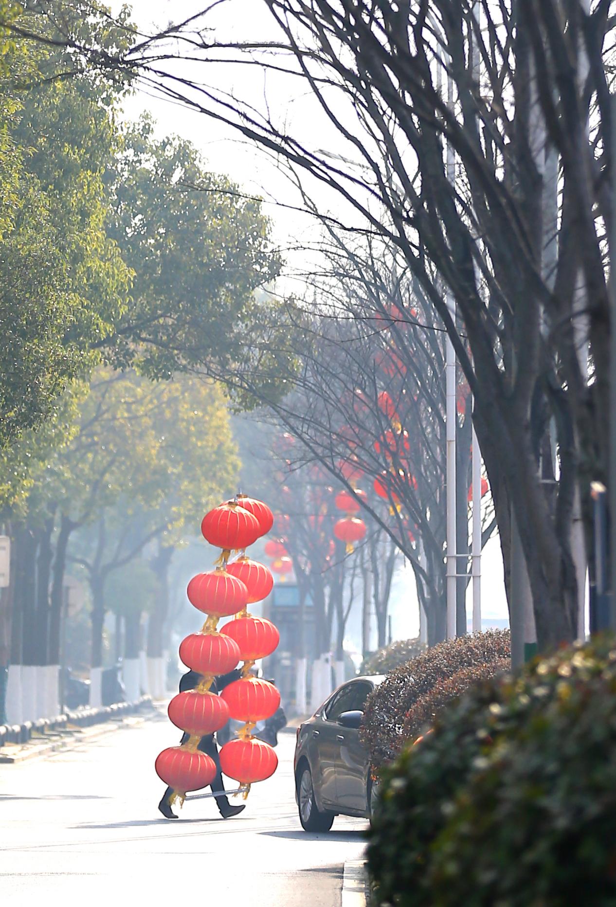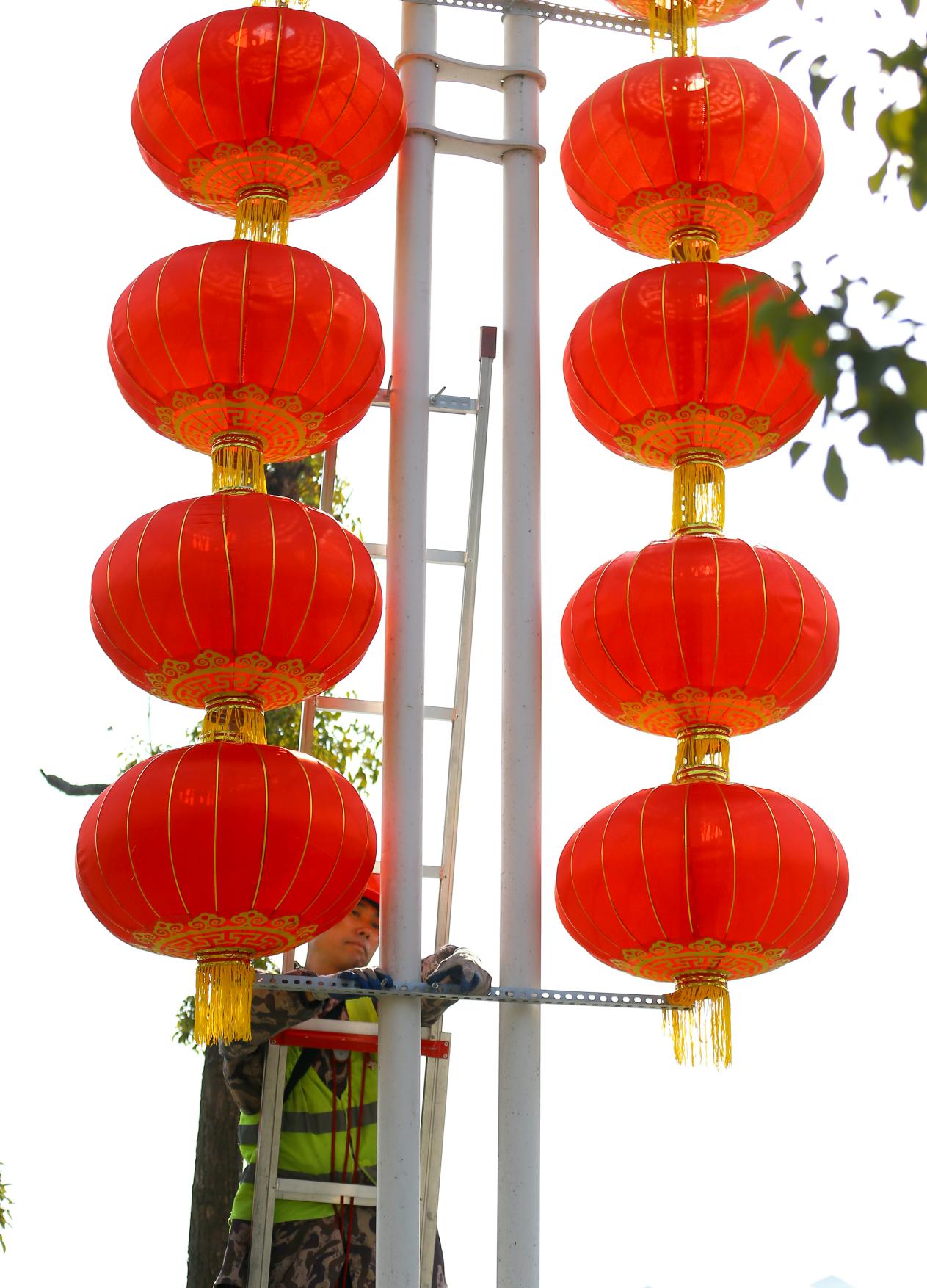 1月20日,庐山大道市政人员在行道旁悬挂灯笼。随着新春佳节的临近,我市主城区行道旁陆续挂起火红的灯笼,春节的氛围越来越浓。