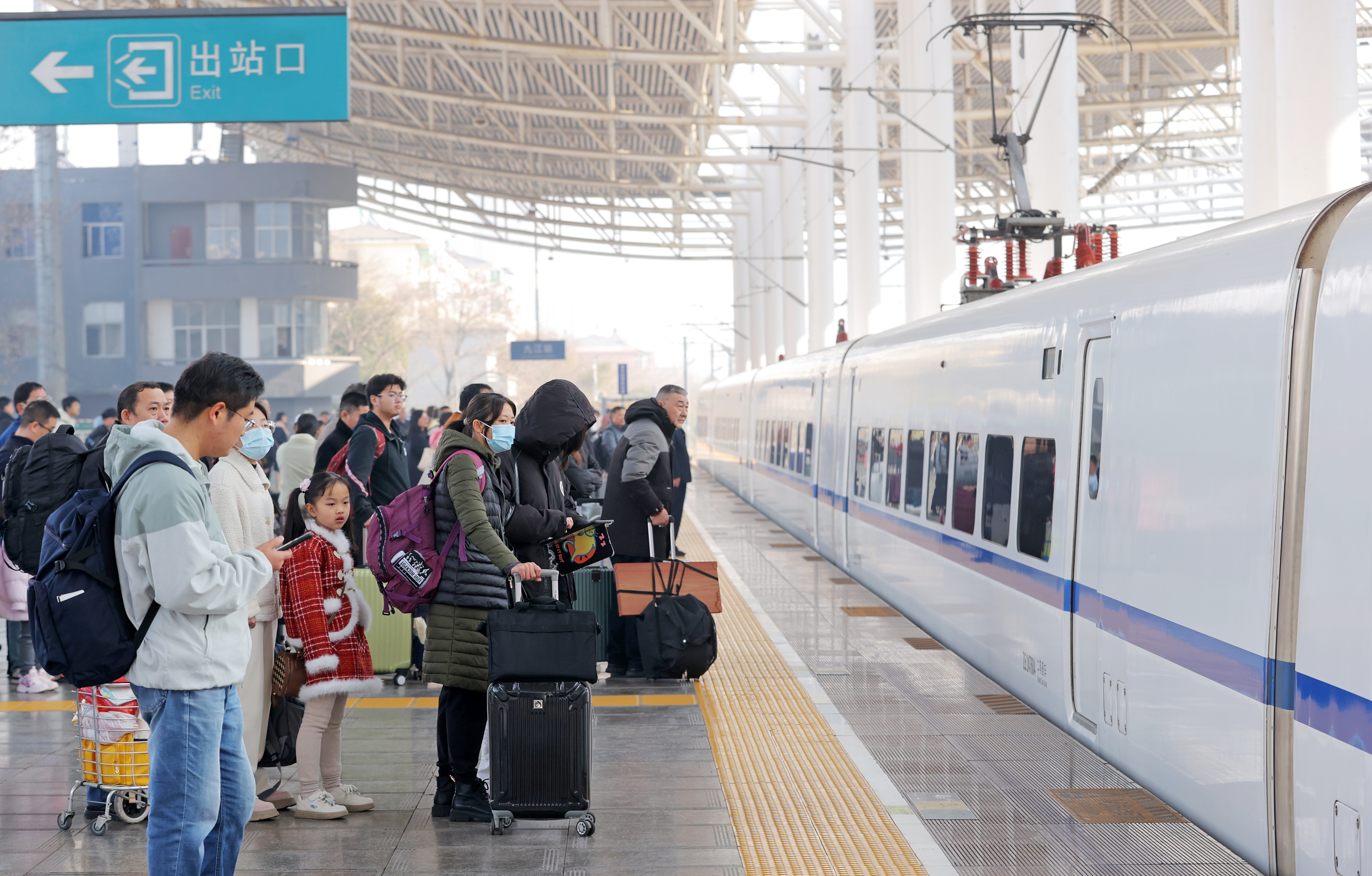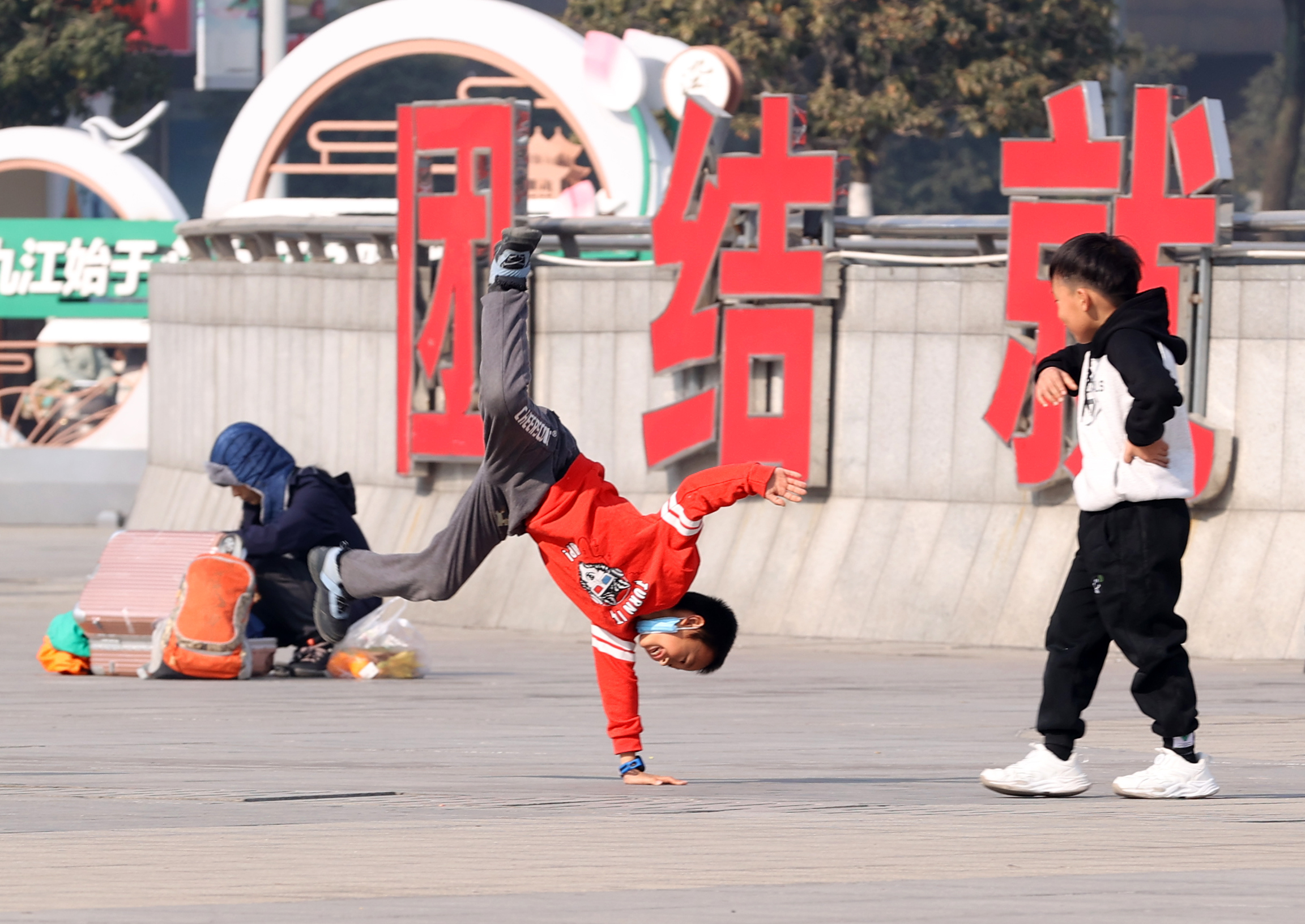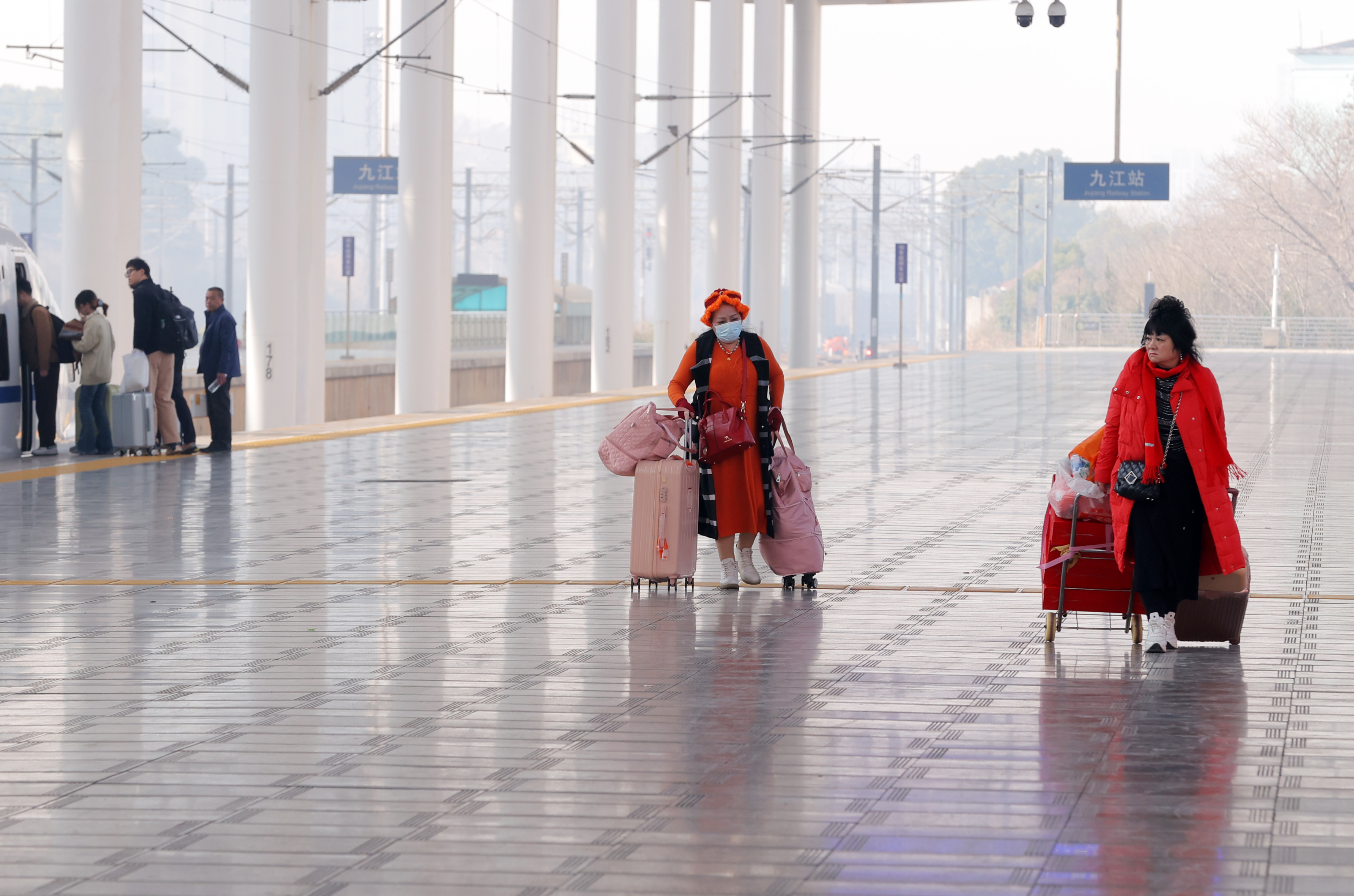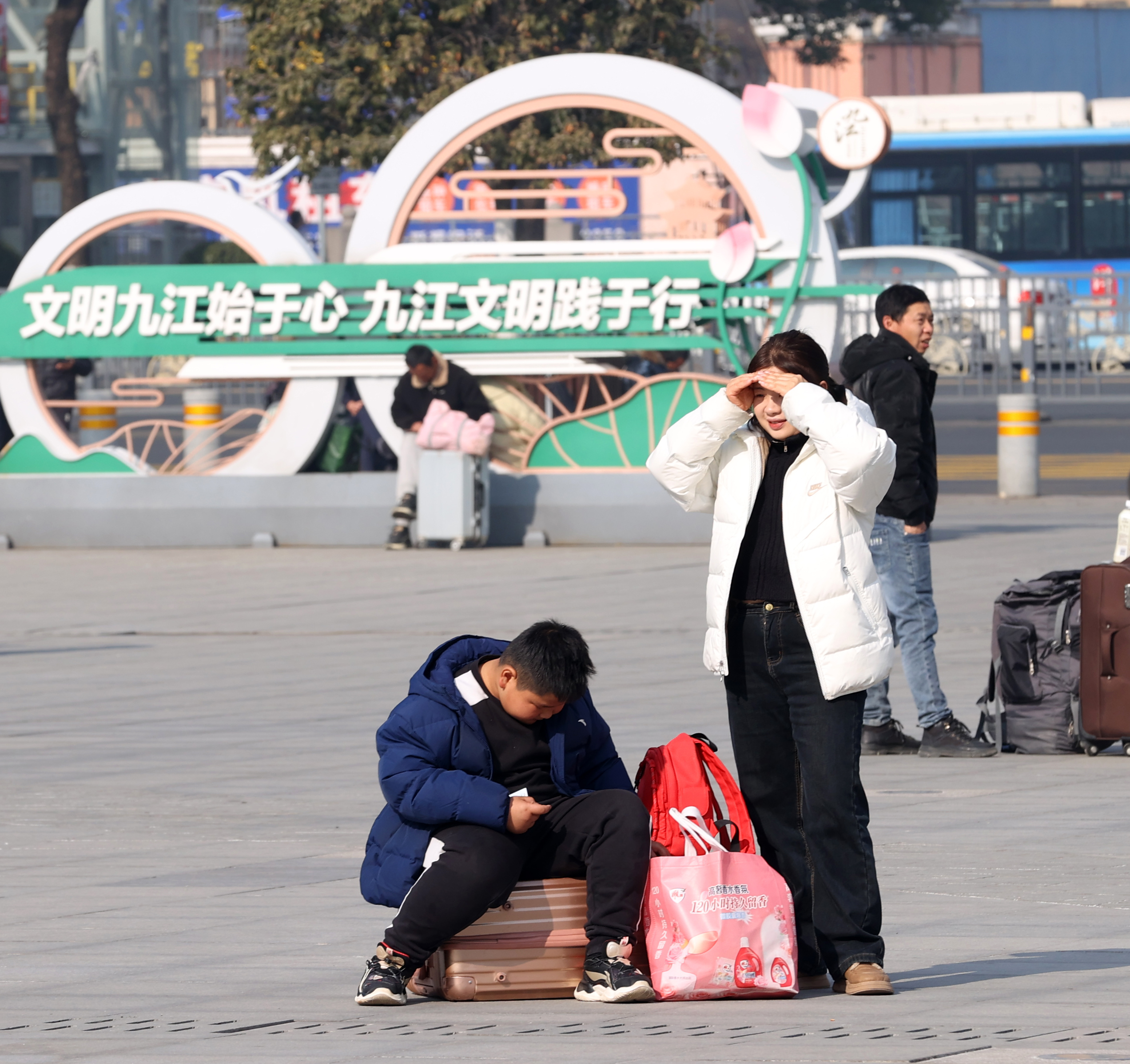 在九江火车站广场上,尚未进站的旅客蹲在地上慵懒地晒着太阳、刷着手机,孩子们始终精力十足,饶有兴致地翻起跟头来。上午10点30分,一对拄着拐杖的老人手牵着手,向工作人员打听接站的情况,他们期待的那趟列车要下午5点多才到。站台上,列车在大家的瞩目下缓缓进站,下车与上车,到站与启程,尽管身处旅程的不同阶段,但充盈在人们内心的喜悦与幸福却是相通的。