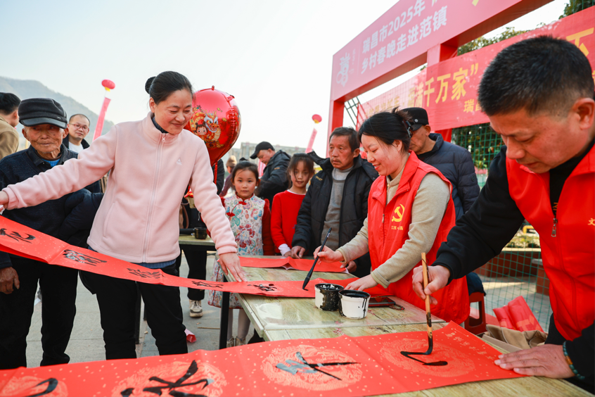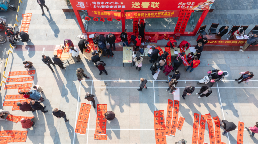 日前,瑞昌市范镇河灯广场,书法志愿者现场为群众写春联。春节临近,瑞昌市组织书法志愿者深入乡村及社区为群众免费书写春联,传递节日祝福。