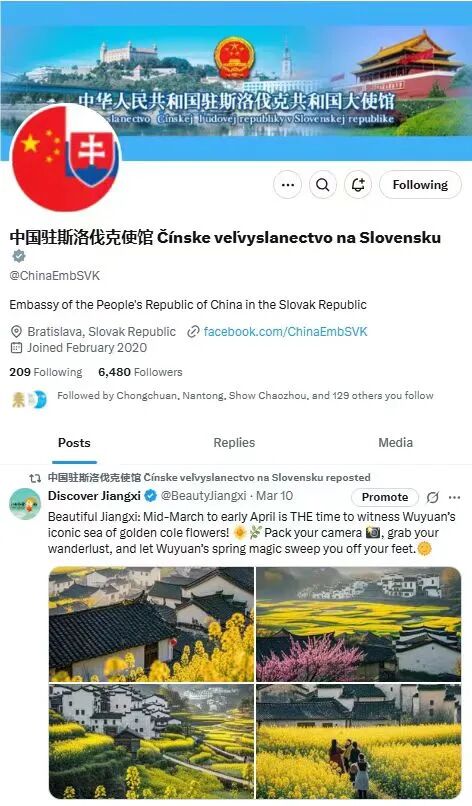近日,中国驻斯洛伐克使馆官方账号@ChinaEmbSVK在社交平台facebook上点赞并转发了 DiscoverJiangxi 发布的江西春日大片——金黄的油菜花田、白墙黛瓦的徽派村落、云雾缭绕的青山……瞬间引起了了斯洛伐克网友的讨论:“这不就是童话里的春天吗?”