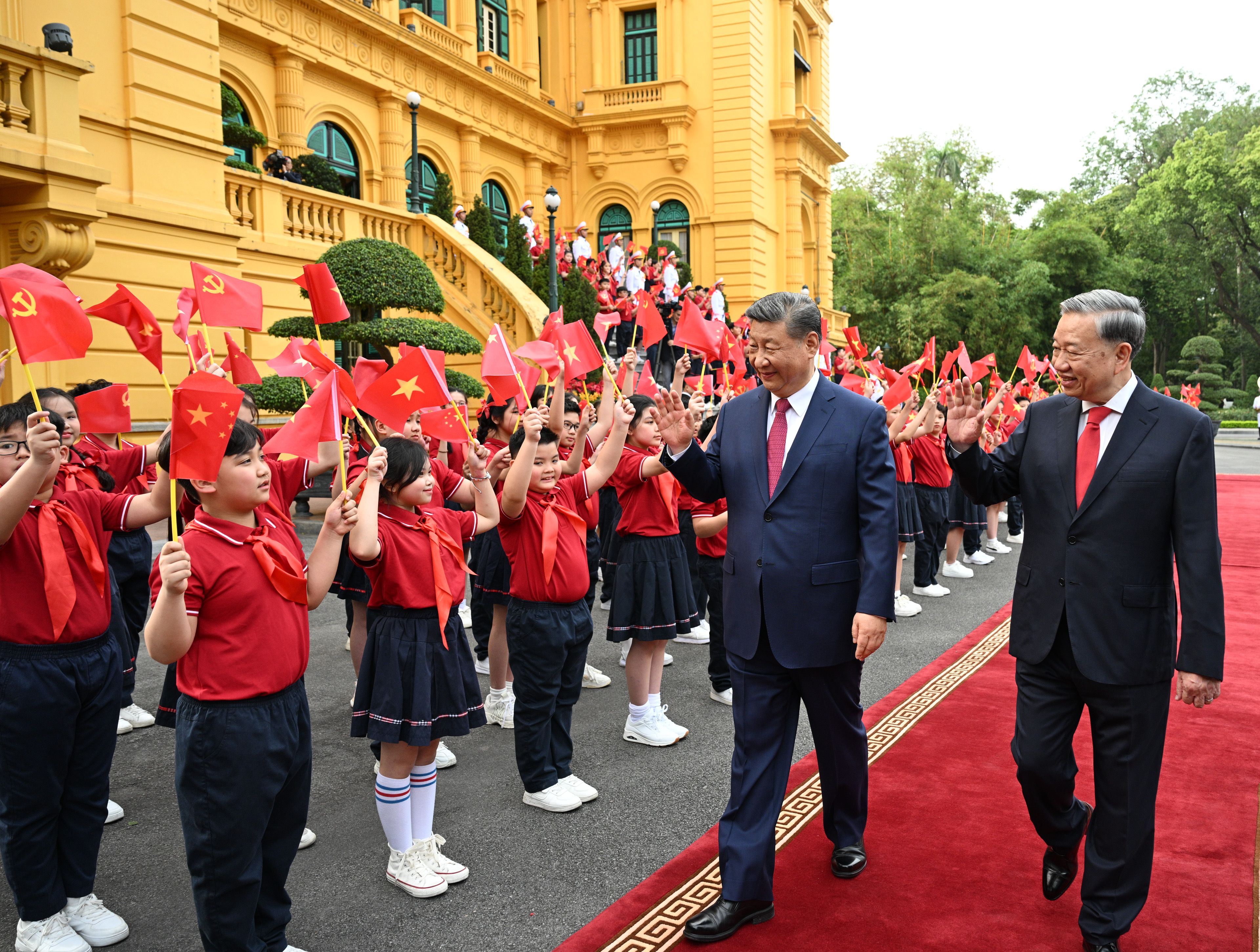越共中央总书记苏林为对越南进行国事访问的中共中央总书记、国家主席习近平举行隆重欢迎仪式,两位领导人在红毯上并肩前行。