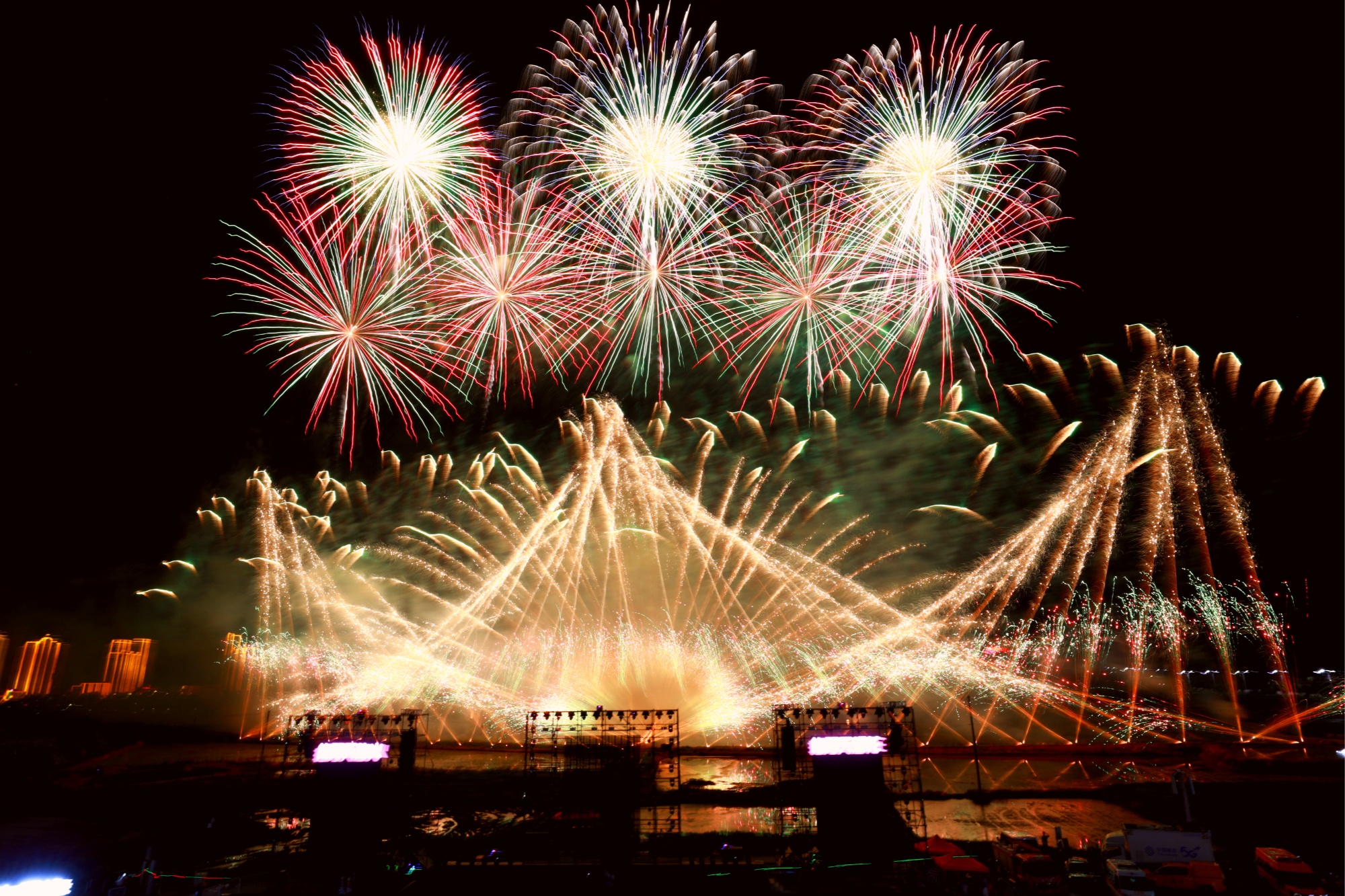 当晚,动感电音骤然响起,舞台灯光闪耀,狂欢正式开启。晚会亮点在于电音与焰火的完美融合:知名歌手与实力DJ轮番登场,用活力节奏推高现场气氛;烟花团队则以精湛技艺呈现盛宴——百米阵地的双层MAX金色瀑布如银河倾泻,万发齐射的“鸿运当头”“五彩烟霞”照亮夜空,非遗火药配方与电子核爆音浪碰撞出独特感官冲击,让观众纷纷举起手机记录震撼瞬间。