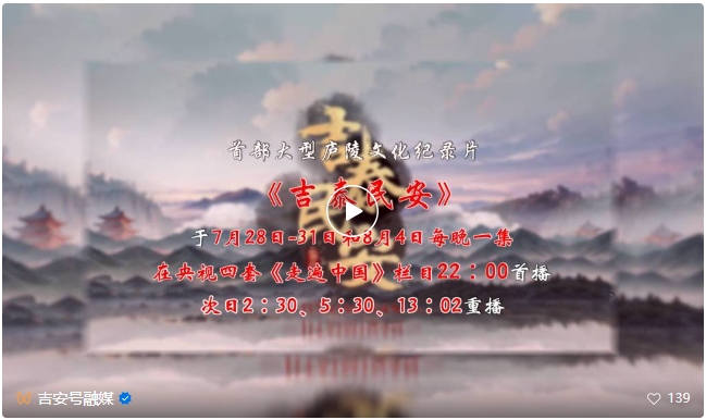 吉泰沃土藏风骨,光影画卷展风华!大型庐陵文化纪录片《吉泰民安》于7月28日至31日、8月4日每晚一集,在央视四套《走遍中国》栏目22:00首播,次日2:30、5:30、13:02重播;吉安电视综合频道于次日11:20、20:30重播,吉安号客户端和吉安融媒视频号同步推送。届时,让我们跟随《吉泰民安》的镜头,共同见证庐陵文化的时代新生,共赴这场跨越时空的文化之约!