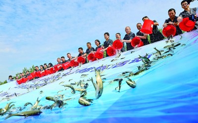 江西九江瑞昌市码头,工作人员将20万尾鱼苗投放到长江。魏东升摄/光明图片