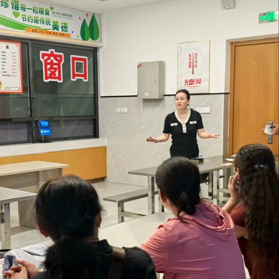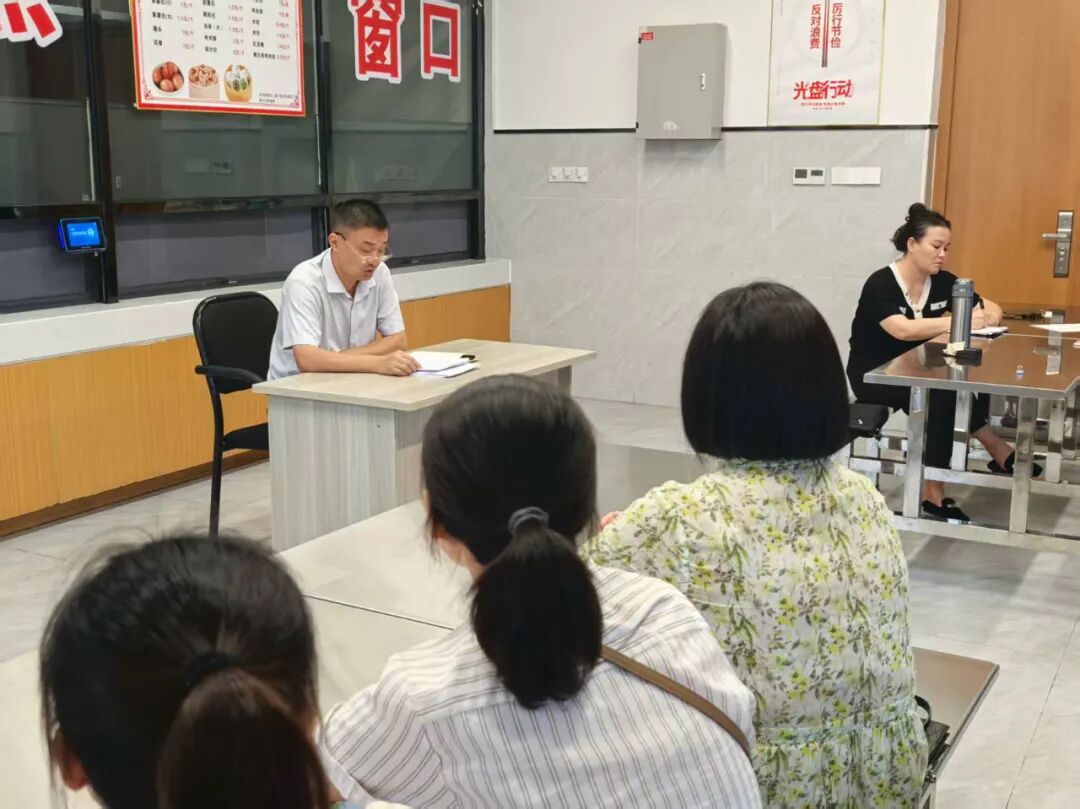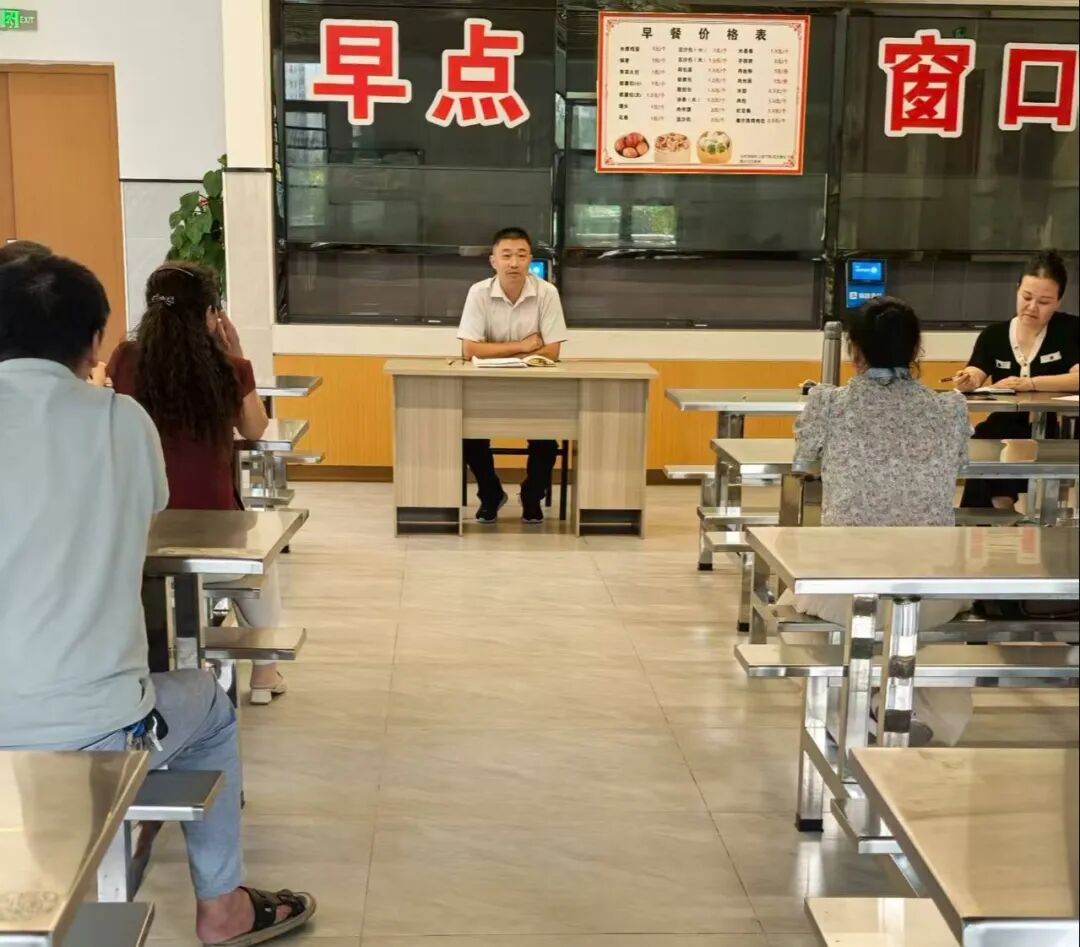 食堂负责人现场进行了全体员工业务培训,对食堂员工从工作上明确了操作的规范,针对具体操作提出了细致的要求,确保提供安全、营养、健康的餐饮服务。