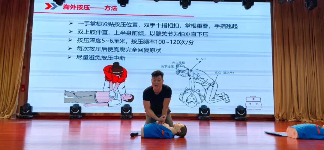 在实操演练环节,同学们热情高涨,踊跃上台参与练习。在熊老师的耐心指导下,大家借助专业模拟人教具,逐步练习心肺复苏的各个动作要领。熊老师及时纠正操作中的常见错误,反复强调规范流程,确保每一位同学真正掌握急救技能。他还结合自身及身边的真实案例,鼓励同学们扎实掌握急救知识,在紧急关头敢于施救、科学施救,用实际行动传递爱心与责任。