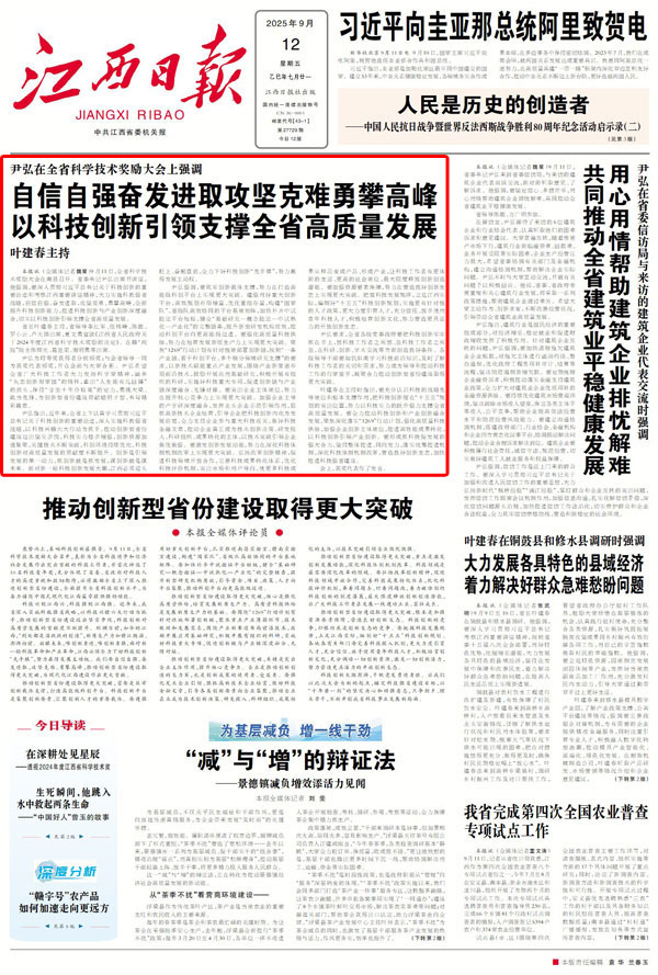 尹弘强调,要筑牢创新载体支撑,努力在打造高能级科创平台上实现更大突破。建强用好重大创新平台,高效规划布局增量、优化重组存量,构建“国家队”、省级队高效协同的平台基地矩阵,加快补齐中试验证平台短板,健全“基础研究—概念验证—中试熟化—产业化”的完整链条,提升新型研发机构质效,推动科创平台向更高能级迈进。要强化高质量科技供给,努力在培育发展新质生产力上实现更大突破。聚焦“1269”行动计划有针对性地部署创新链,按照“一条产业链、若干科创平台、多个细分领域研究支撑”的要求,以新技术赋能重点产业发展,围绕产业新赛道布局前沿技术,鼓励开展应用基础研究,积极开展有组织的科研,实施好科技重大专项,促进创新链与产业链深度融合、无缝对接。要突出企业主体地位,努力在提升核心竞争力上实现更大突破。加强企业主导的产学研深度融合,发挥龙头企业示范引领作用,狠抓高新技术企业培育,引导企业把科技创新内化为发展自觉,全力支持企业参与重大科技攻关,做好科技金融文章,推动企业真正成为技术创新决策、研发投入、科研组织、成果转化的主体,以技术突破引领企业做优做强。要激发创新发展动能,努力在深化科技体制机制改革上实现更大突破。弘扬改革创新精神,促进科技领域开放合作,完善科技成果转化体系,优化科技评价机制,突出市场和用户导向,使更多科技成果从样品变成产品、形成产业,让科技工作者有更体面的生活、更高的社会地位,最大限度释放创新创造潜能。要加强资源要素保障,努力在营造良好创新生态上实现更大突破。把握科技发展规律,立足江西实际,编制好“十五五”科技创新规划,实施更有针对性的人才政策,更大力度引育人才,充分信任、放手使用青年科技人才,积极培育创新文化,努力营造更具活力的开放创新生态。