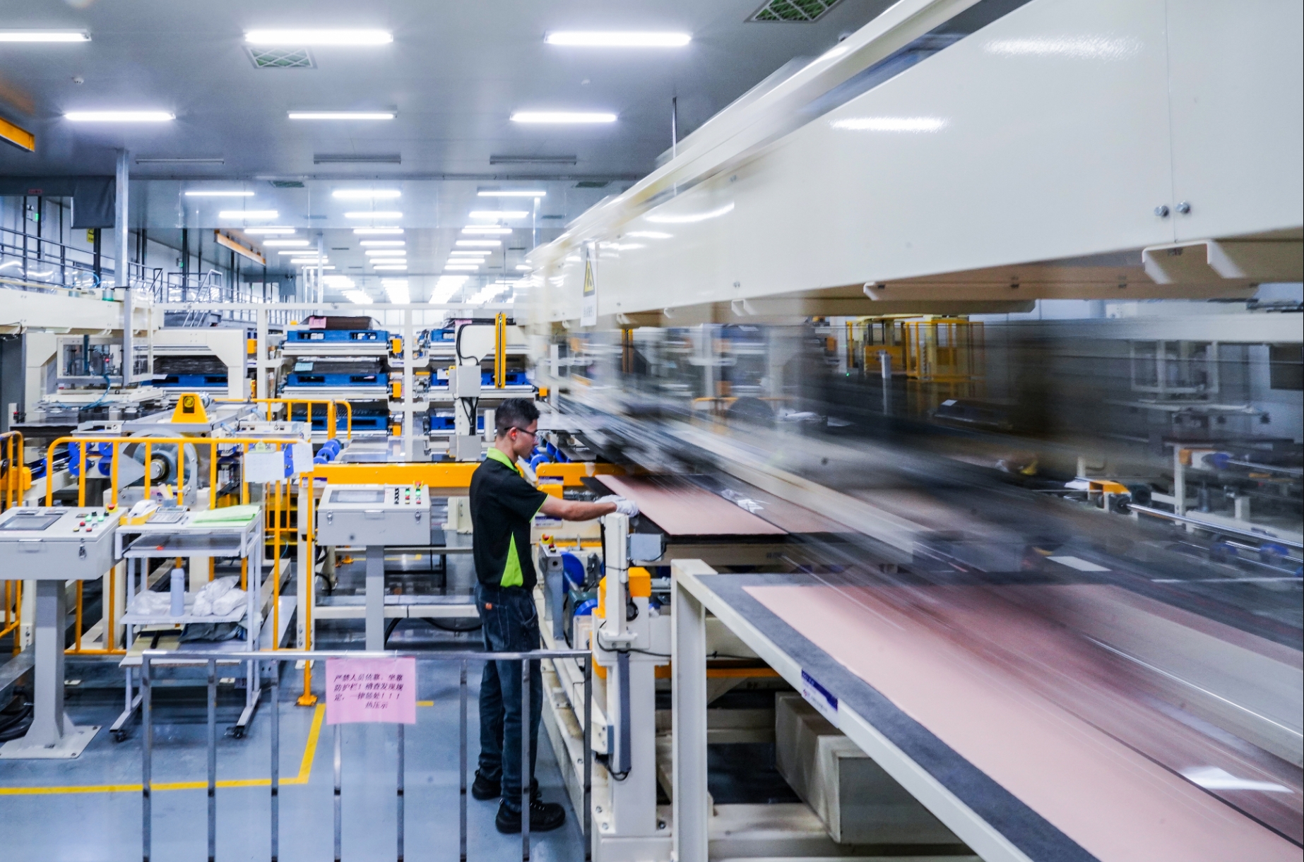 江西联茂电子科技有限公司车间内,智能化设备正高速运转生产产品。该公司是全球覆铜板生产领域的龙头企业之一,产品广泛应用于5G通讯、数据中心等多个领域。
