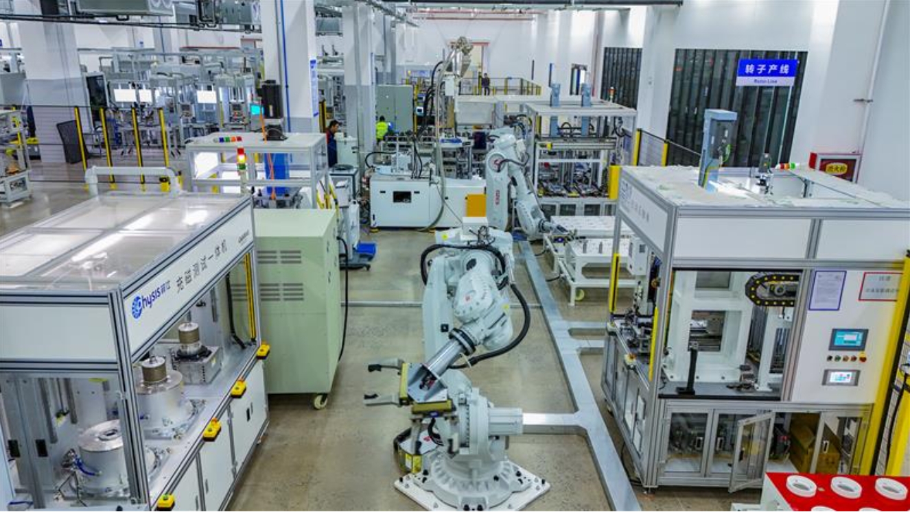 在菲仕绿能科技(赣州)有限公司智能化生产线上,工业机器人正在装配永磁电机。