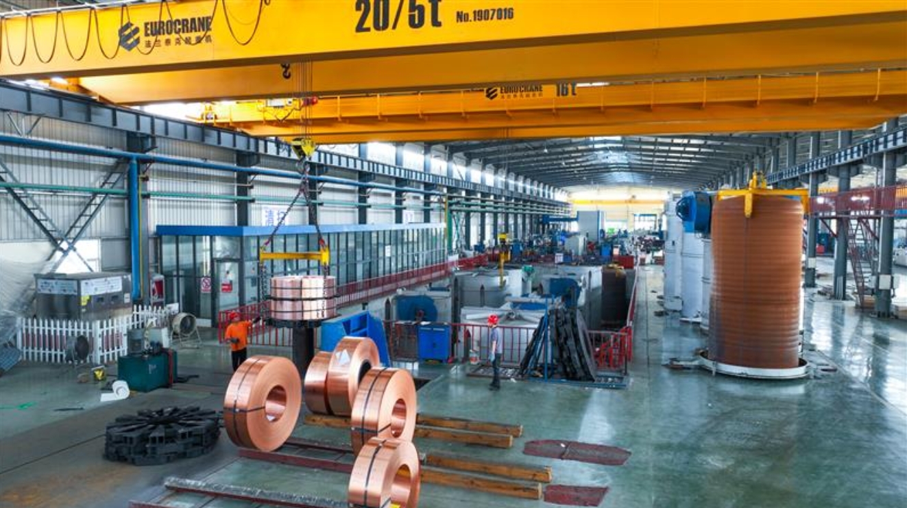 在瑞金市精工智造链主企业江西金拉铜箔生产车间,工人借助数字平台高效作业。