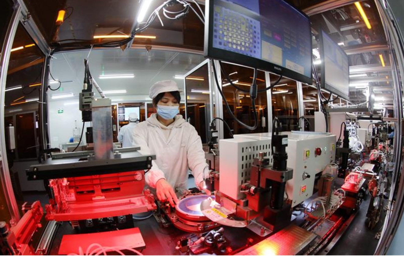 位于信丰县高新技术产业园区的江西信芯半导体有限公司,工人在5G功率保护芯片及IC封测项目生产线上操作。