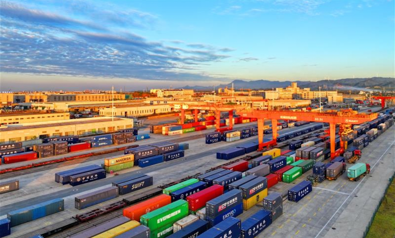 赣州国际陆港货场,进口木材和出口家具货物集装箱吊装作业快速有序进行。