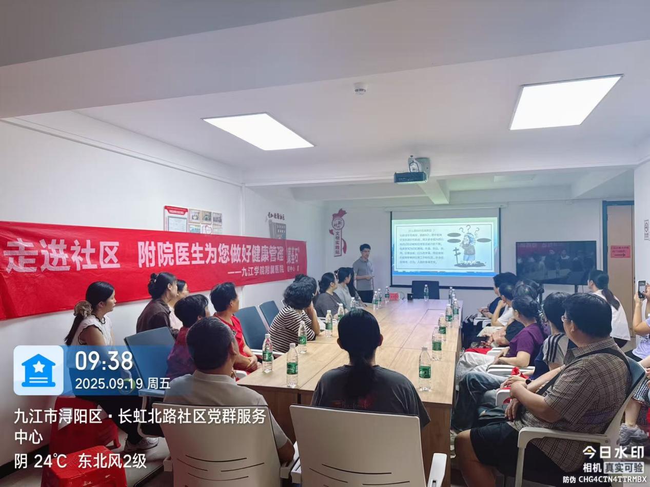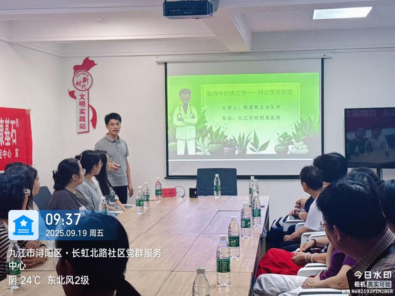 九江新闻网讯 9月19日,浔阳区卫生健康委联合区民政局和九江学院附属医院,在白水湖街道长虹北路社区举办2025年世界阿尔茨海默病月主题宣传活动,今年主题是“早防早治,守护认知”。本次活动以健康讲座的形式开展,共有30余名社区居民参加活动。九江学院附属医院戴庭敏主治医师用直观的统计数据和通俗易懂的语言,系统讲解了阿尔茨海默病的科普知识、早期信号和防治措施。现场听众时而凝神静听,时而低头记录,不愿错过任何一个重要知识点。