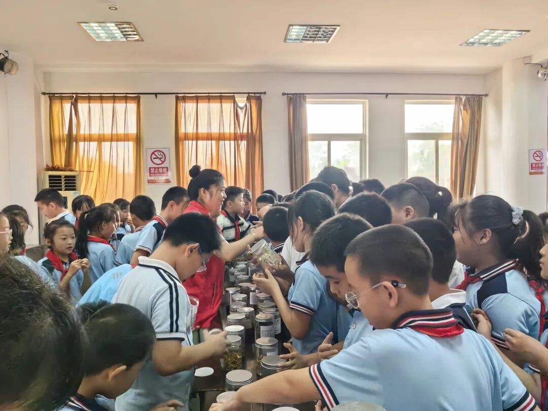 随后的中药辨识中,活动氛围愈发热烈。药剂科副科长曾娟花通过“看外形、闻气味、讲功效”的方式,循循善诱地为同学们讲解山楂、薄荷、金银花等数十种常见中药材的形态特征与药用价值。孩子们好奇地凑近观察,轻嗅药香、浅尝药味,并不时举手提问,在亲身体验中揭开中药的神秘面纱,真切感受传统药材的独特魅力。