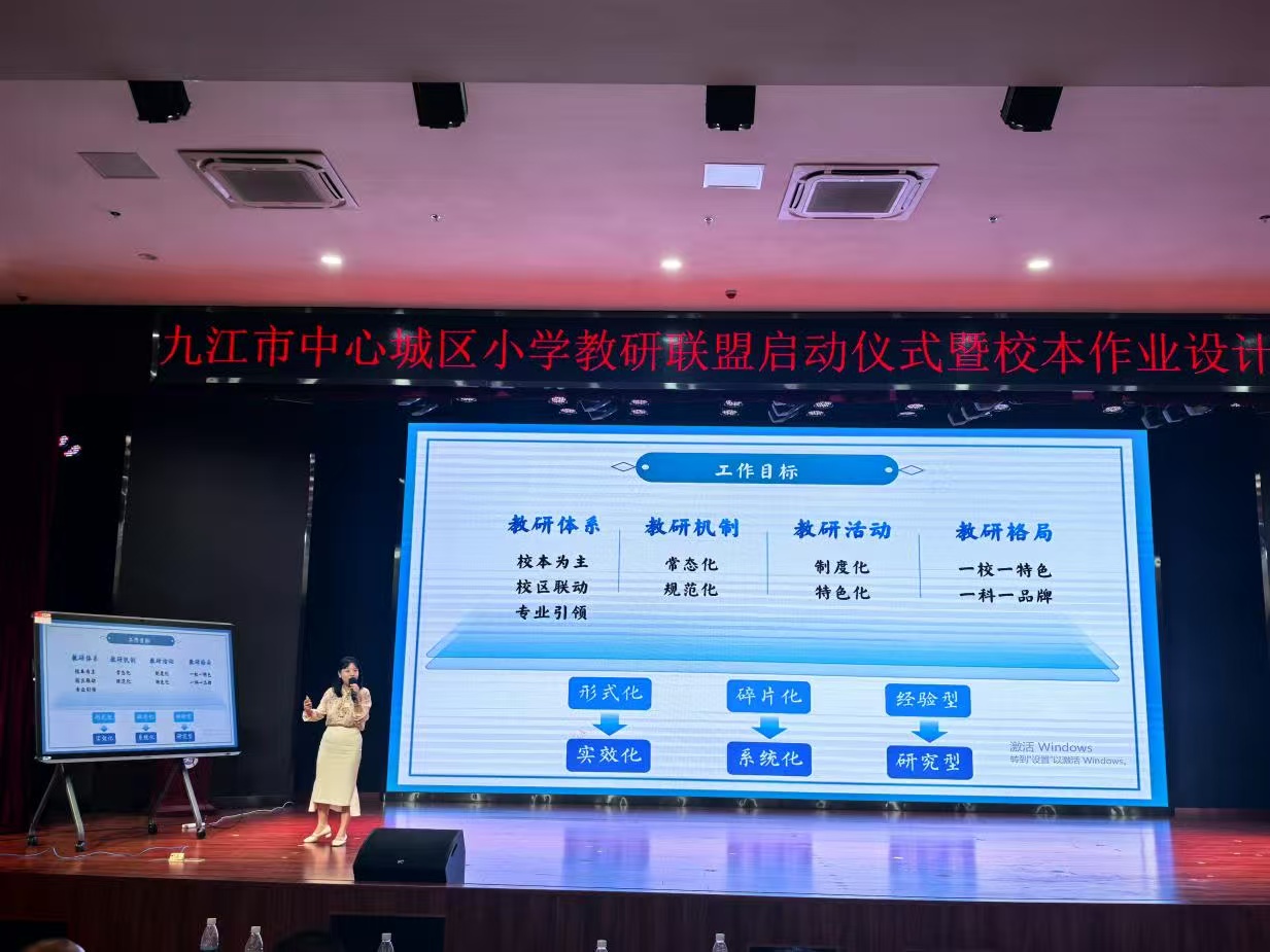 在联盟校分享校本教研活动设想以及校本作业资源建设经验分享环节,副校长于艳燕代表九江小学进行了校本教研及作业资源建设经验分享。她表示,学校以《关于加强全省中小学校本教研工作的指导意见》为引领,坚持“精准发力、特质生长”的工作理念,推动教研工作从“形式化、碎片化、经验型”向“系统化、实效化、研究型”转变。具体措施包括夯实常规教研、强化主题研讨、优化作业设计,并通过“青蓝工程”“名师示范”“跨校区联动”等方式提升教师专业素养。此外,学校还注重跨学科融合及项目化实践,积极开展新课标学习评估、课例研究及特色展示活动,全面助力教师成长与学生发展。