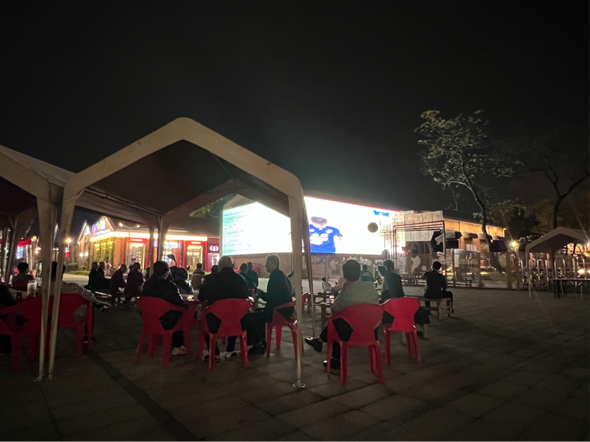 “好球,这里比球场看台还热闹!”市民王文俊兴奋地喊道。比赛进行到第48分钟,九队率先攻破球门、成功进球。刹那间,他毫不犹豫地和身边素不相识的球迷击掌相庆,爽朗的笑容在灯光下格外灿烂。