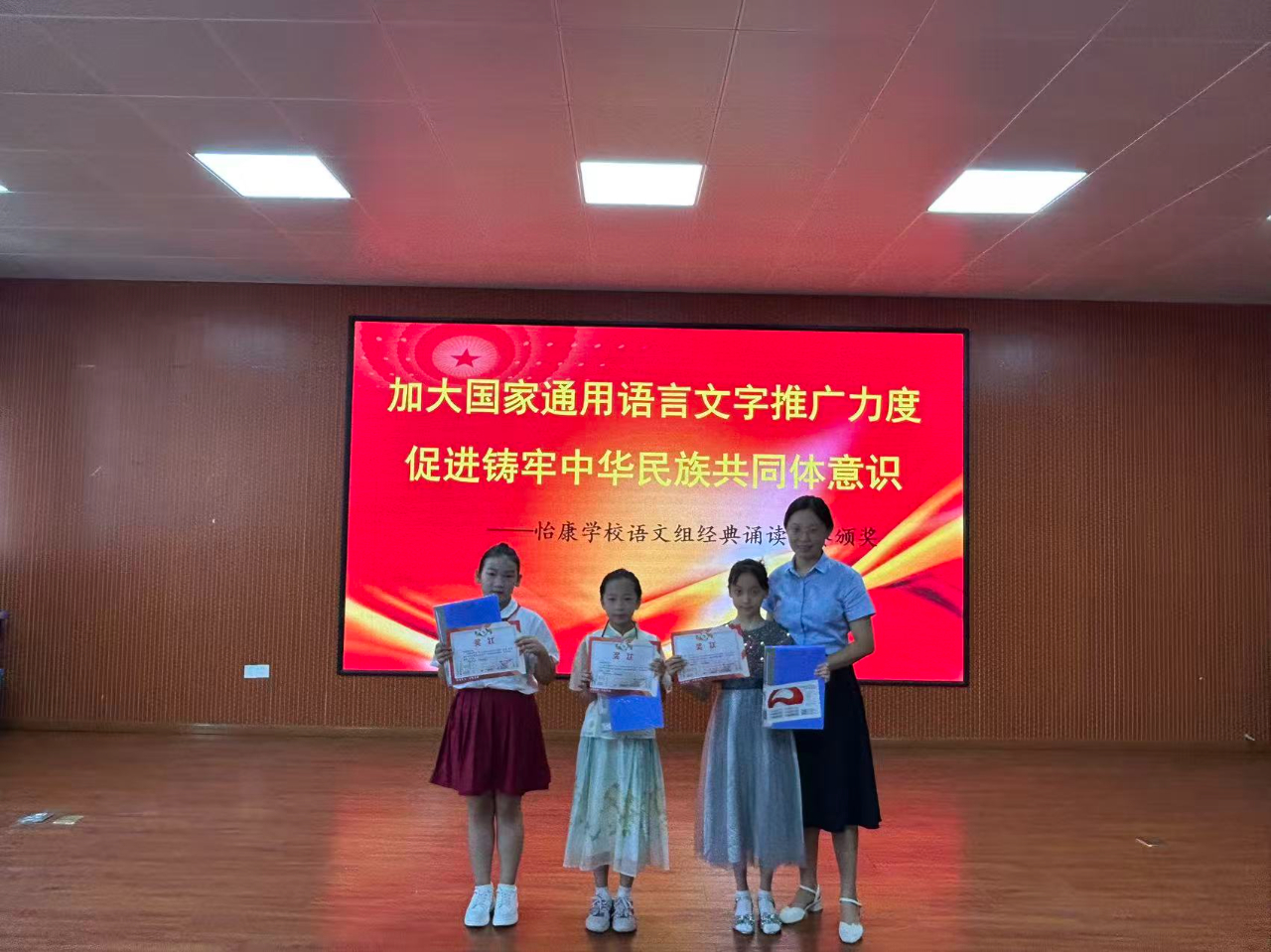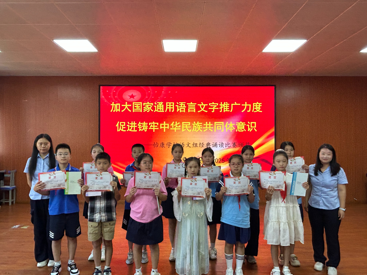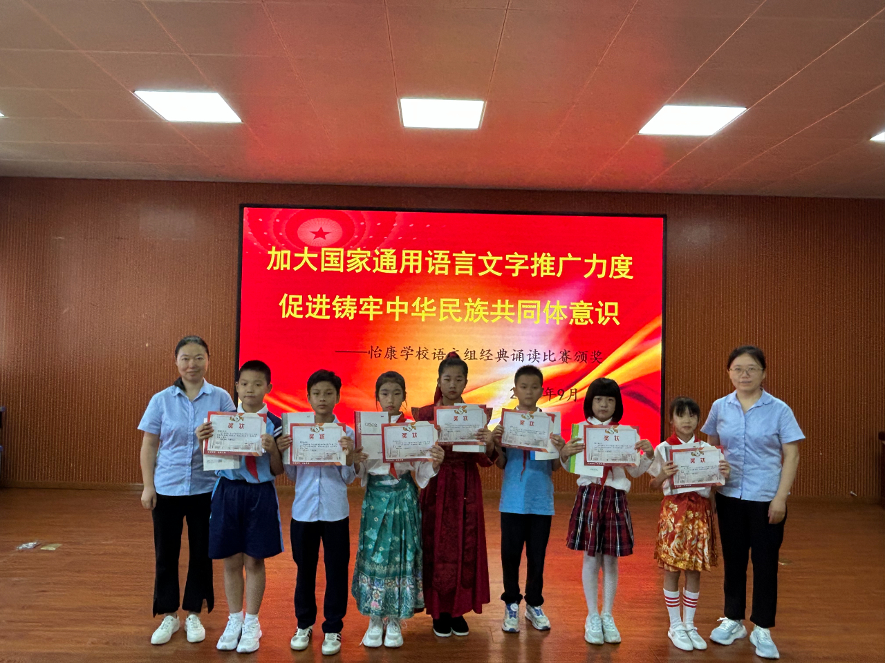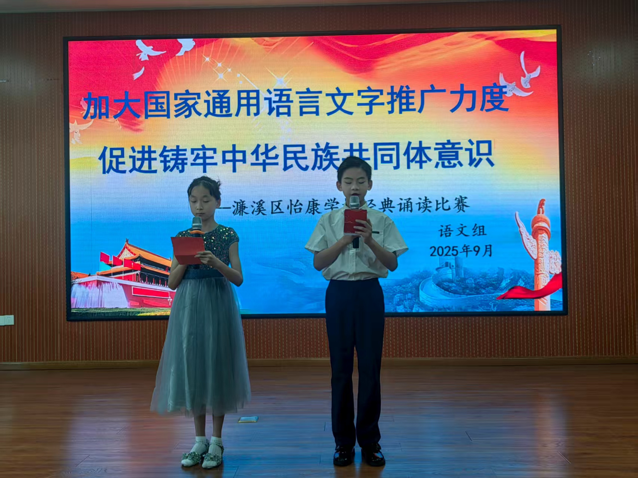 九江新闻网讯 为进一步弘扬中华优秀传统文化,引导学生爱读书、读好书、善读书,9月17日上午,濂溪区怡康学校大会议室里,一场以“加大国家通用语言文字推广力度,促进铸牢中华民族共同体意识”为主题的经典诵读比赛在此拉开帷幕,五年级共22名选手同台竞技,以声传情、以诵会友,展现新时代少年的文学风采与语言魅力。