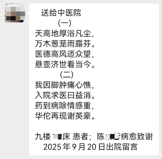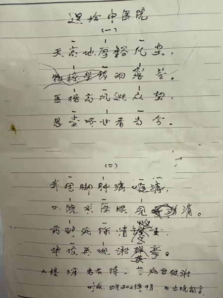 欣喜之余,陈老先生亲手执笔,颤巍巍地写下两首诗作。这字里行间的真诚与感慨,既是老人的认可与赞许,更是对后辈的鼓舞与激励。湖口县总医院中医医院院区医务人员将不负厚望,奋发前行,以更精湛的医术、更贴心的服务,为广大群众的身体健康和生命安全保驾护航。