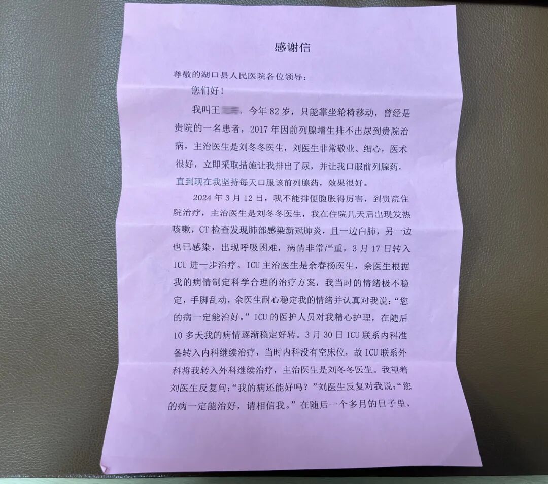 九江新闻网讯(肖玲)近日,湖口县总医院人民医院院区收到一封患者来信,里面一张粉色的纸承载了写信人对医院医护的诚挚谢意,更是一段跨越数年、生死相依的医患情的生动写照。写信人是今年已经82岁的王爷爷。