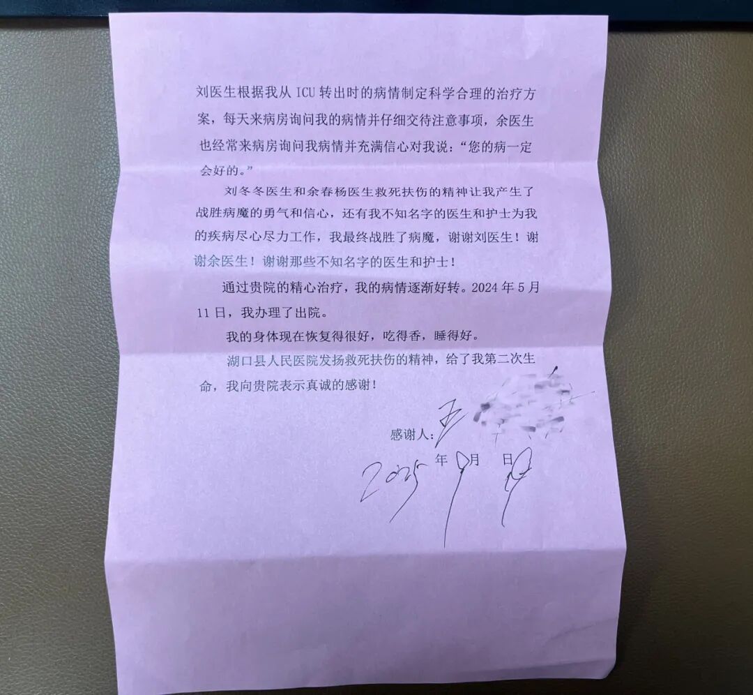 “湖口县人民医院发扬救死扶伤的精神,给了我第二次生命。”在感谢信的末尾,王爷爷的辞藻虽不华丽,却饱含着沉甸甸的感激。“老爷子恢复得不错,吃得香,睡得好,这真是个好消息。”刘冬冬、余春杨等人得知王爷爷如今一切安好,更是欣慰不已。
