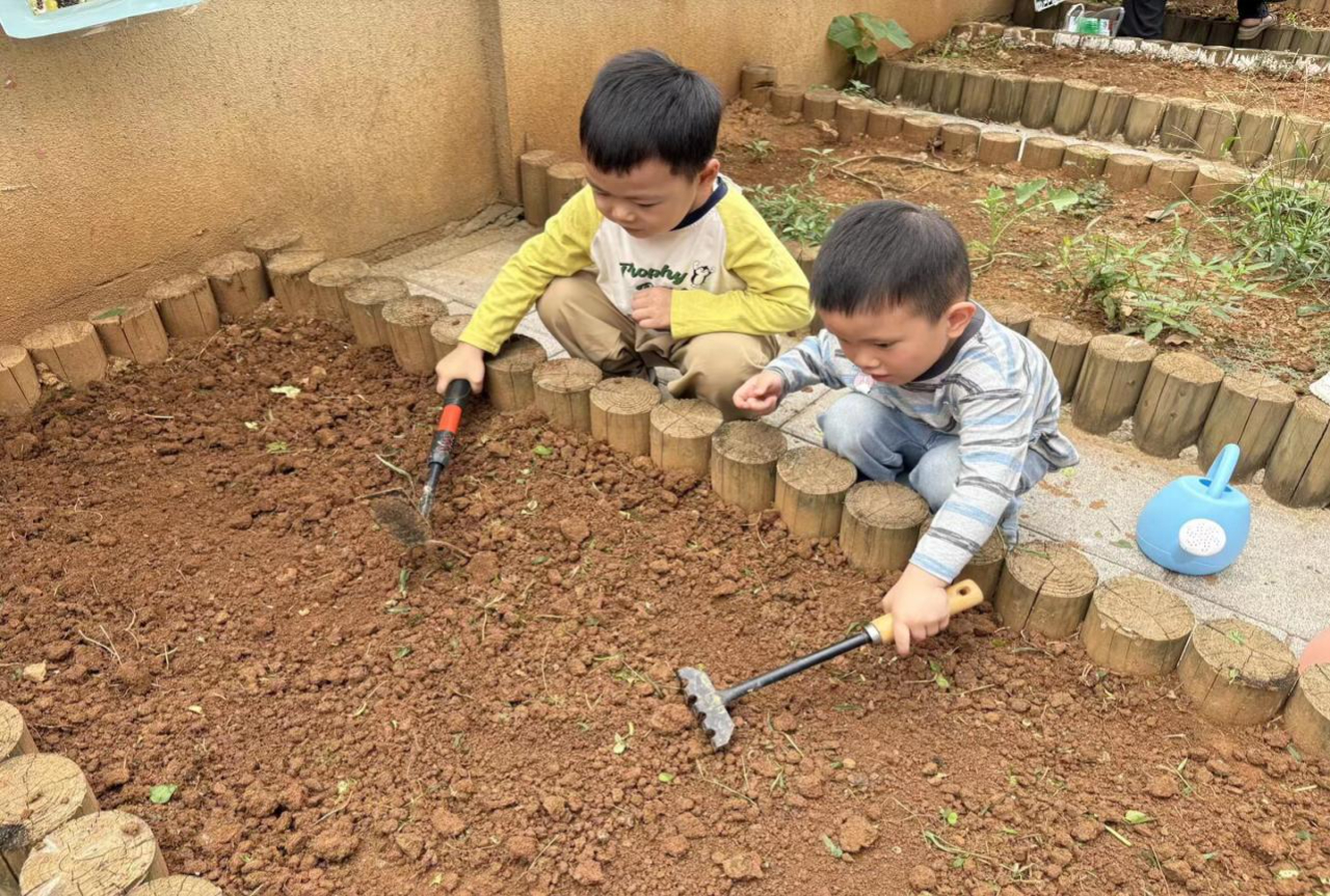 在种植园现场,小朋友们挥着小铲子“嘿哟嘿哟”除草,给土地挠痒痒松土;把小种子轻轻放进“小床”,再端着小水壶“沙沙沙”浇水,相信在“小园丁”们的精心照顾下,小种子会茁壮成长的!