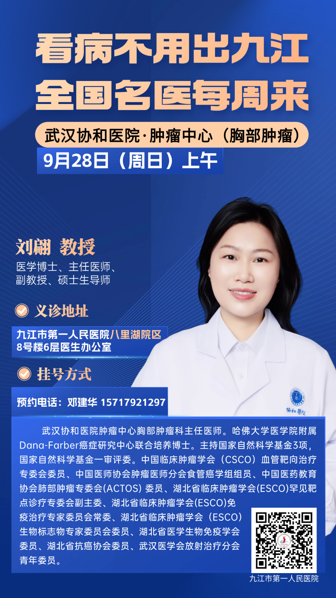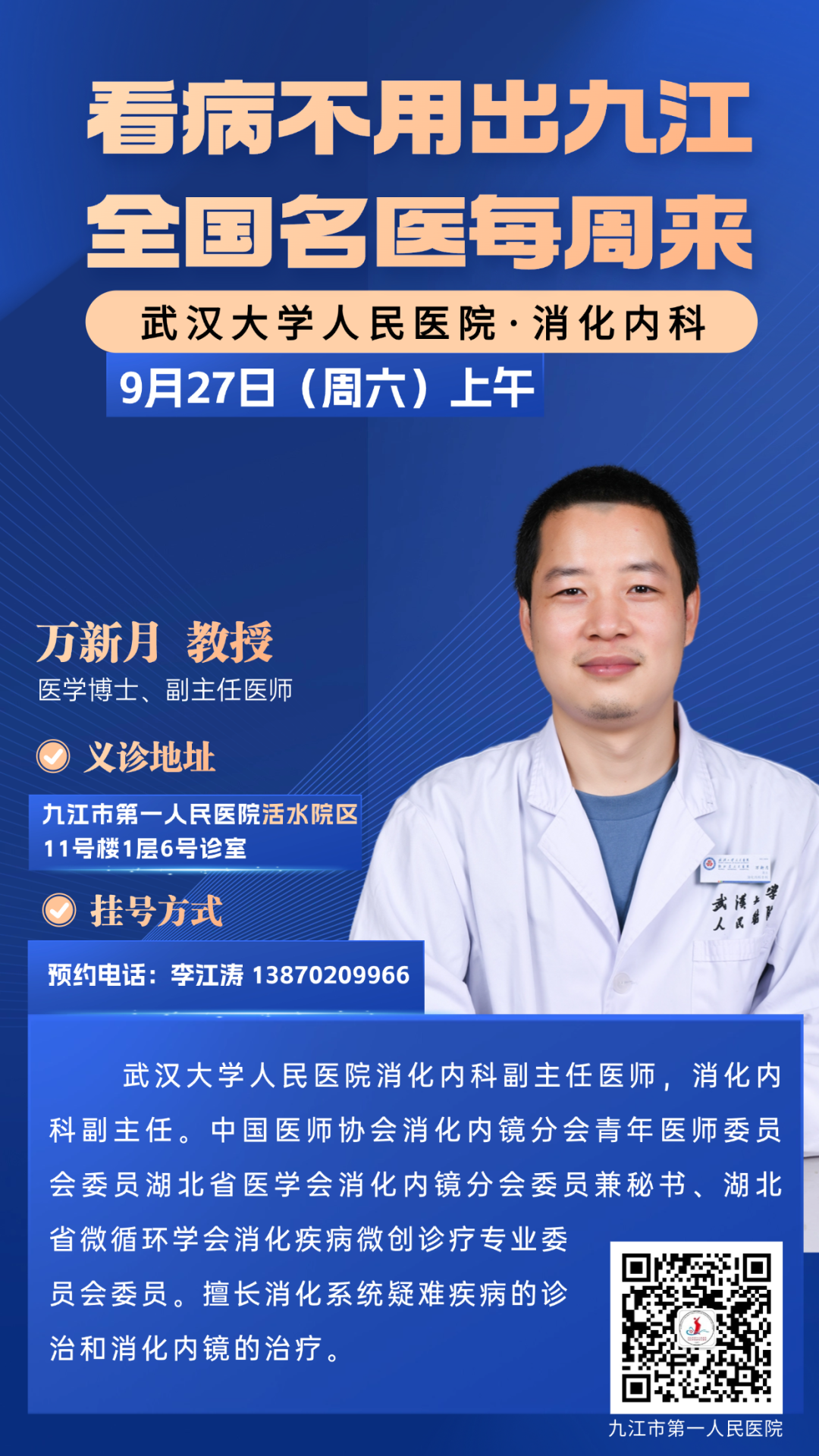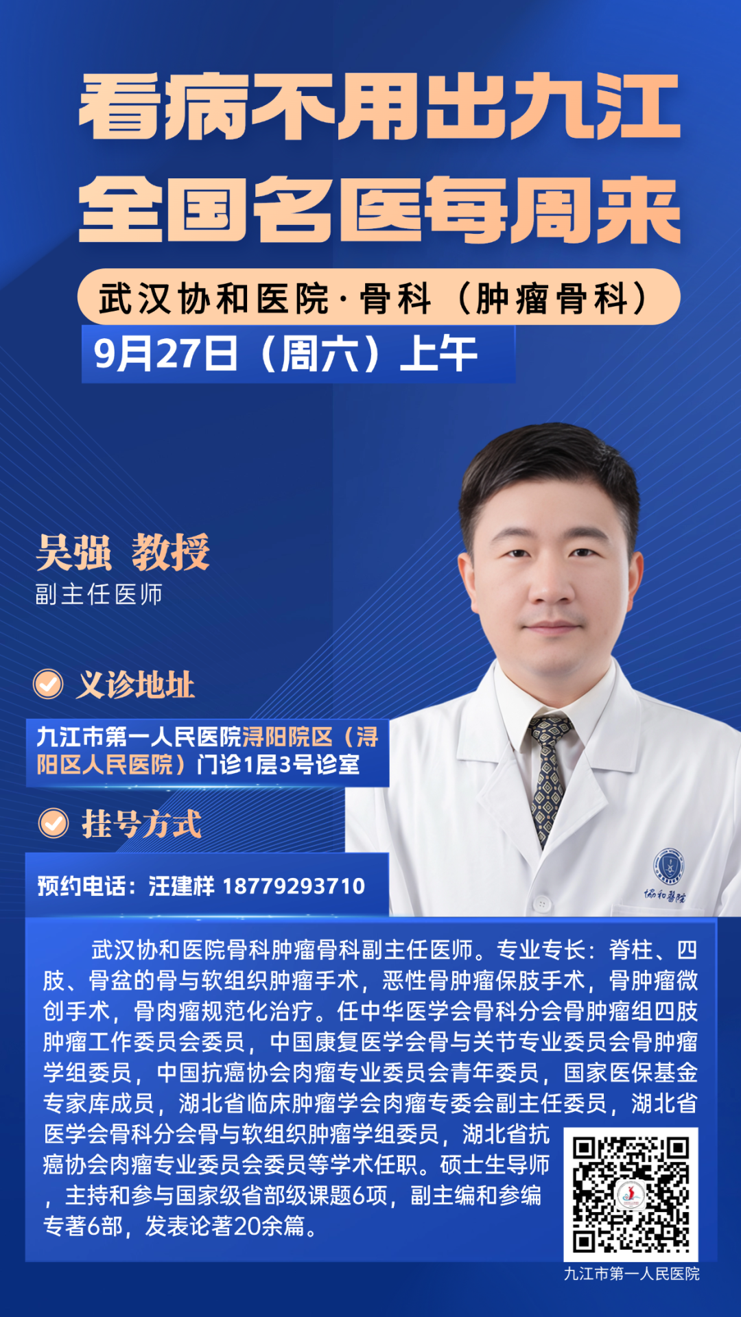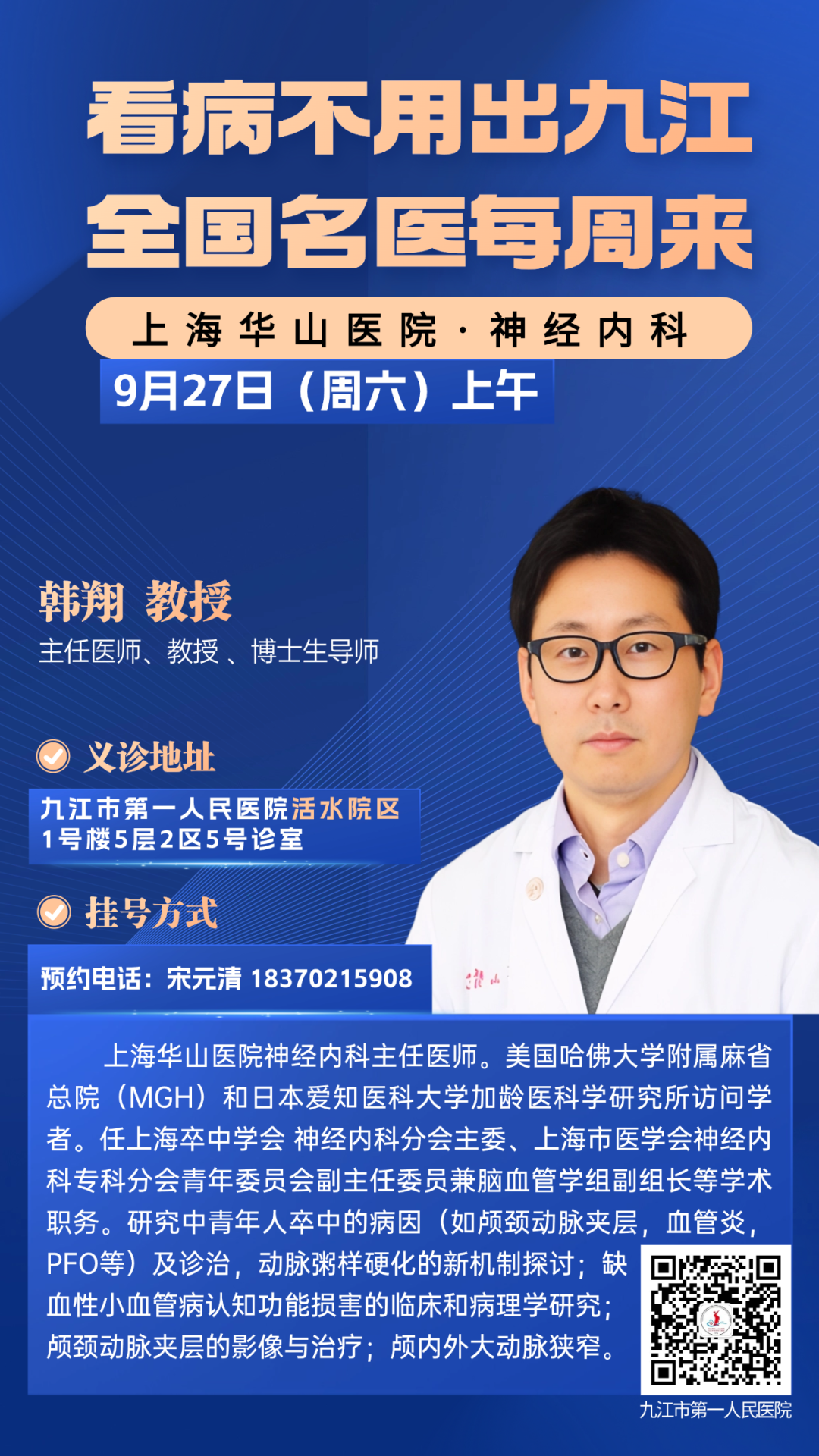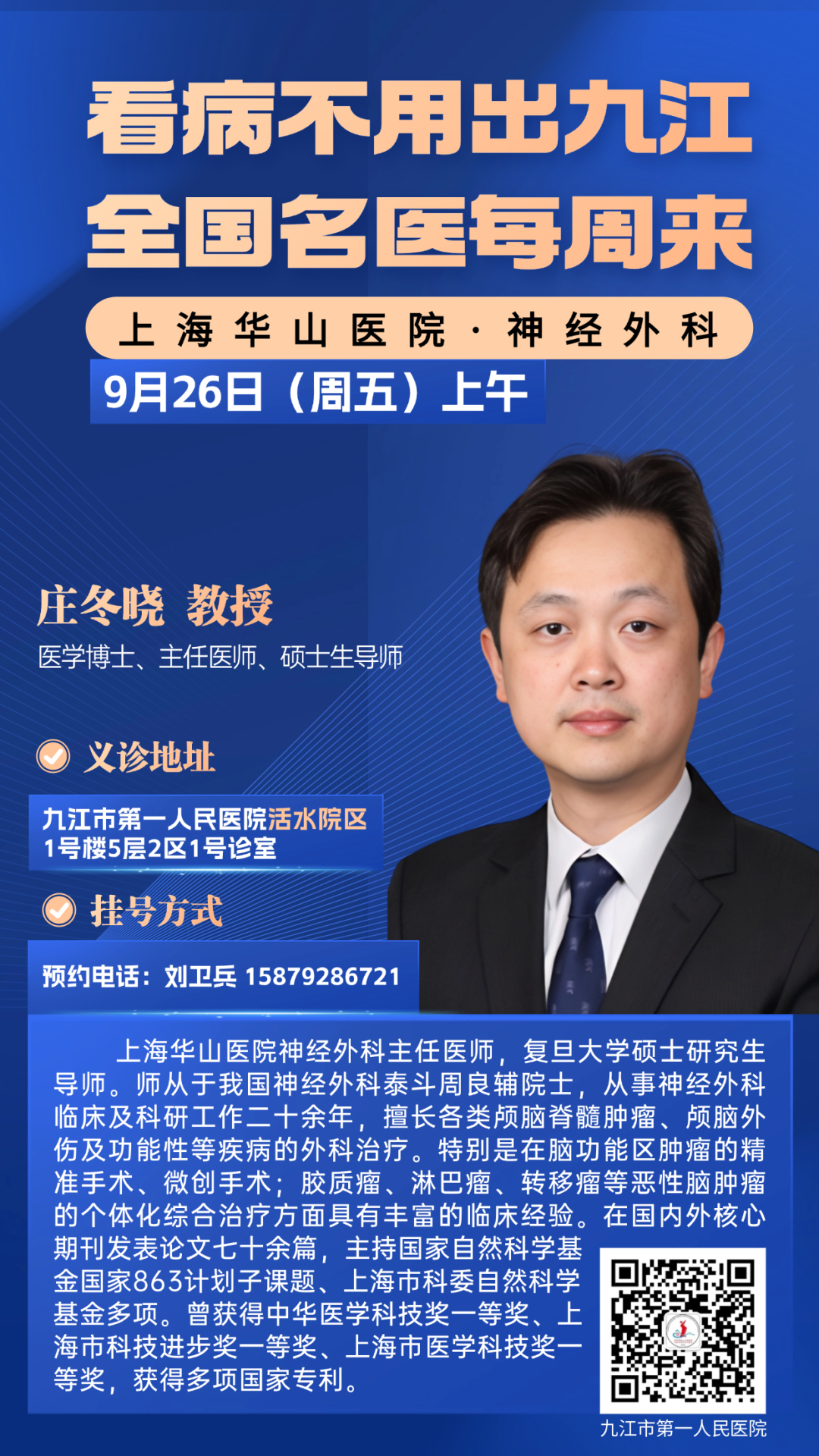 9月26日-29日,上海华山、武汉协和、武大人民医院六位教授在九江市第一人民医院坐诊,有需要可预约