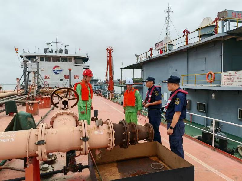 执法人员来到九石化1号码头对现场作业船舶开展现场检查和安全宣传工作。执法人员首先检查了船岸作业安全措施落实情况,随后对船舶关键性设备进行了检查,同时提醒船舶负责人近期天气变化,要求船方持续开展隐患排查和风险管控,严格落实安全管理措施,强化作业期间安全巡查;装卸货期间严格落实船岸安全检查制度,严格遵守安全与防污染操作规程,加强泵舱及液货管系、货舱透气等关键性设施设备运行情况的安全巡查。同时要求船舶强化在岗人员培训,组织开展针对性应急演习等工作,确保消防器材完整和人员适任,确保装卸作业安全。