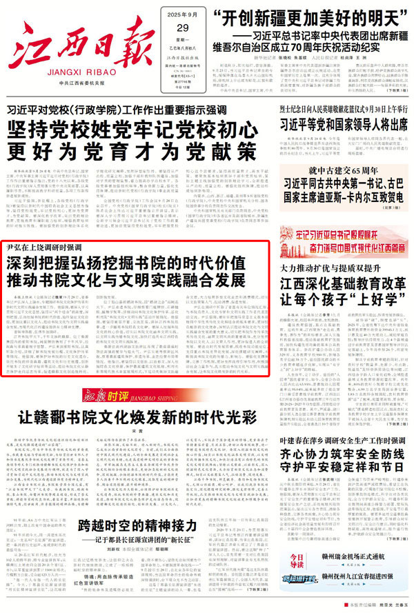 大江新闻讯 江西日报全媒体记者魏星报道:9月28日,省委书记尹弘深入上饶市,专题调研书院文化保护传承和新时代文明实践融合发展工作。他强调,要深入学习贯彻习近平文化思想,坚持从“两个结合”的高度,深刻把握、挖掘弘扬书院的时代价值,始终坚定文化自信,更加注重以文化人,推动书院文化与文明实践融合发展,为现代化江西建设提供有力精神支撑。