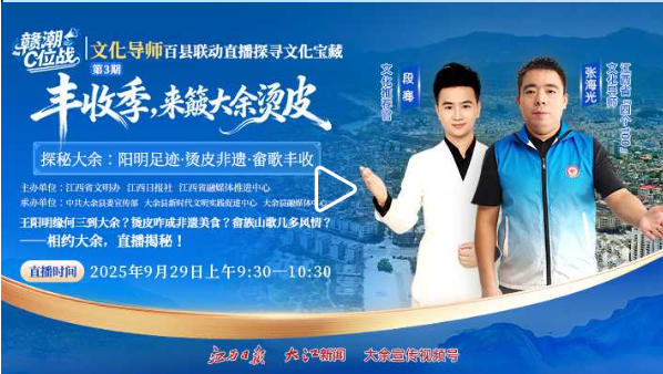 9月29日上午9:30—10:30,“赣潮C位战”丨文化导师百县联动直播活动第三站将循着文脉与丰收气息,走进这座千年古城。江西省“四个100”文化导师将化身“文化探宝人”,追溯王阳明与大余的不解之缘,探寻“此心光明”的精神印记;驻足非遗工坊,见证大余烫皮从米浆到酥脆的全手工制作,品味舌尖上的千年技艺;聆听畲族山歌的嘹亮腔调,感受少数民族文化与客家风情的交融;更有抓鸭抓猪、“混战黄金圈”等趣味互动,沉浸式体验丰收季的热闹欢腾。