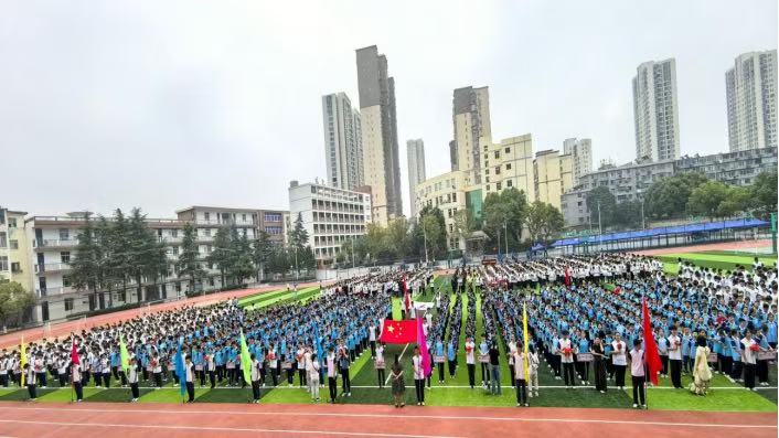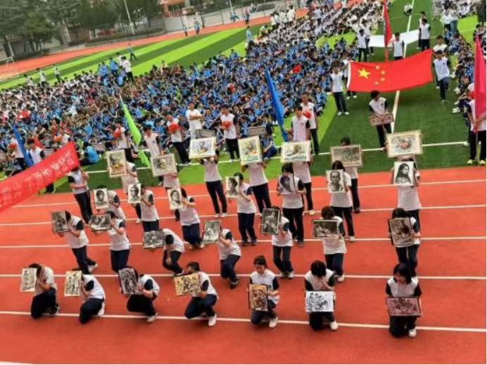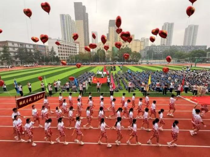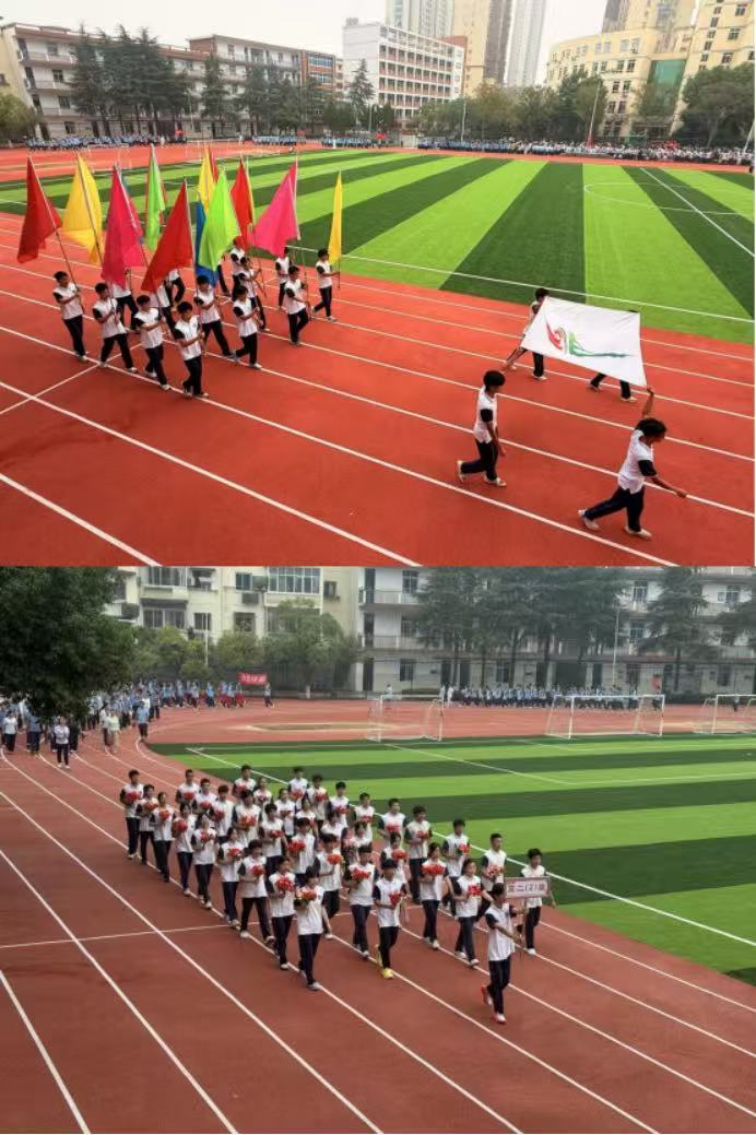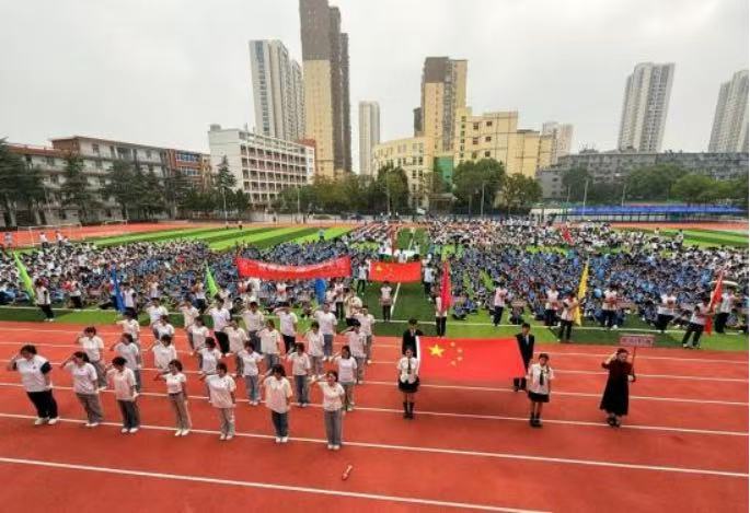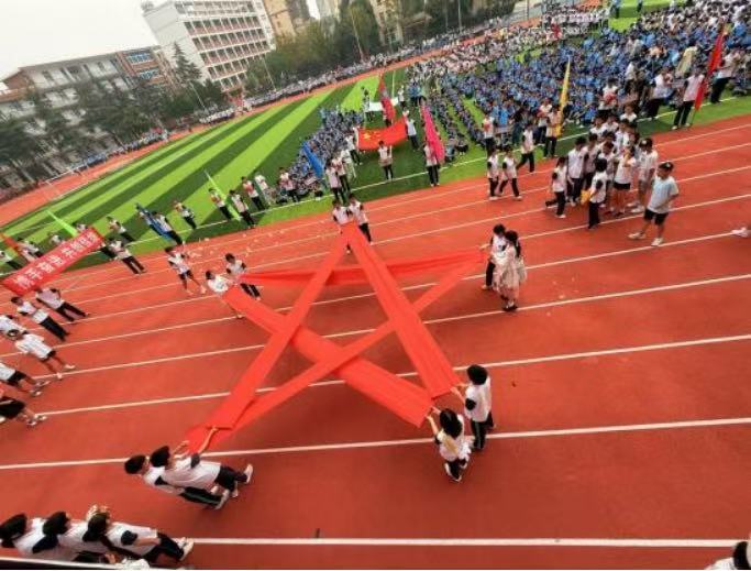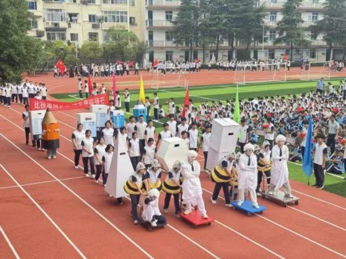 伴随着《运动员进行曲》,国旗队、校旗队、鲜花队、彩旗方阵和裁判队率先入场。各班级方阵随后登场,学生身着特色班服,喊着响亮口号,通过挥舞小国旗、表演舞蹈、朗诵诗词、花样跳绳,以及身着玩偶装、汉服,融入六中美育特色的美术方阵展示自制艺术作品等创意形式,展现班级凝聚力与学子蓬勃向上的风采。