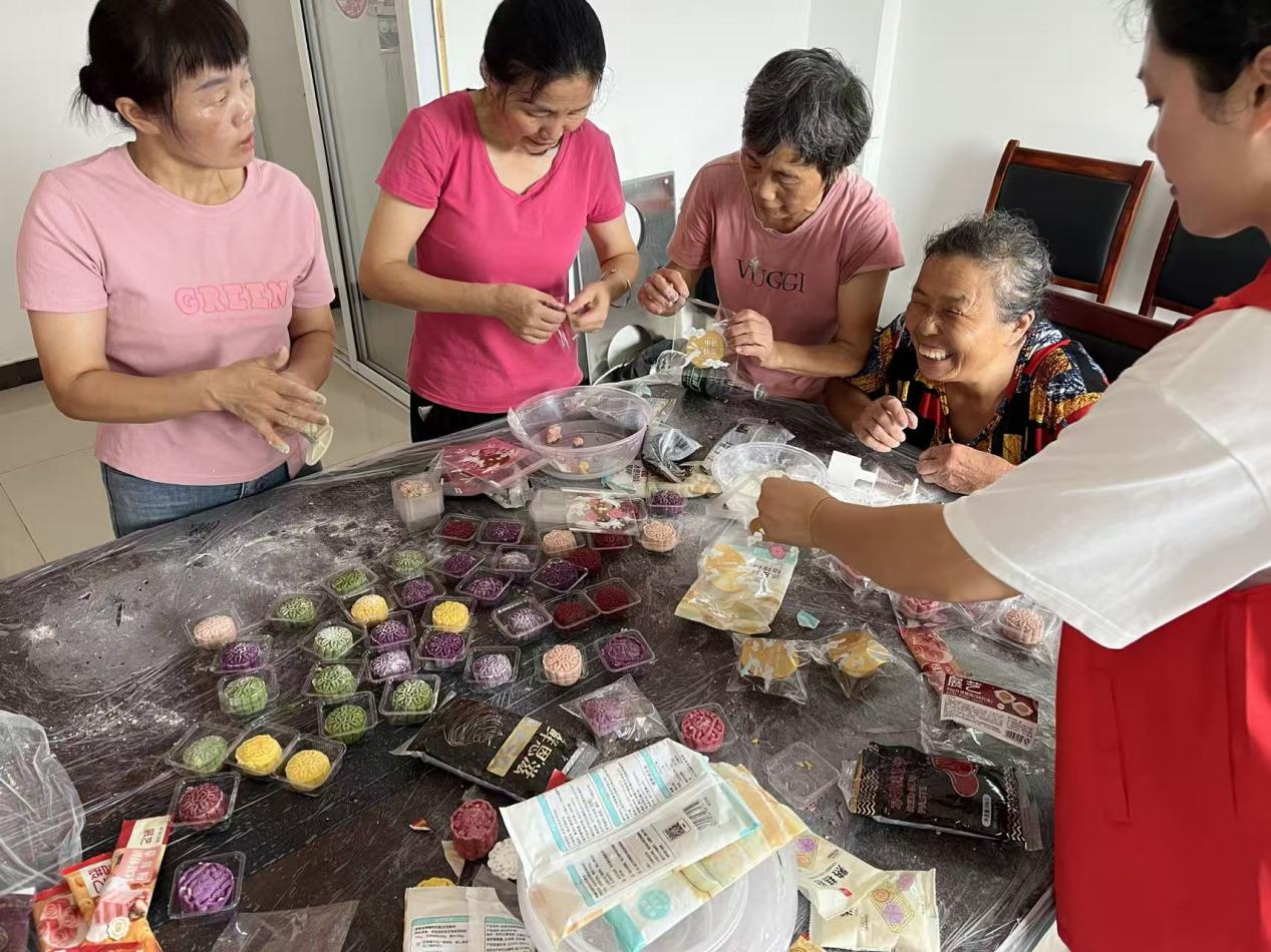 活动分为两个环节,第一个环节是冰皮月饼制作,工作人员向居民们详细讲解冰皮月饼的制作流程,居民们分组协作,将不同口味的冰皮与馅料巧妙结合,通过揉、捏、压等步骤,制作出一个个造型精致、色彩诱人的冰皮月饼。活动现场弥漫着香甜的气息,大家脸上洋溢着专注与喜悦,充满了浓浓的节日氛围。