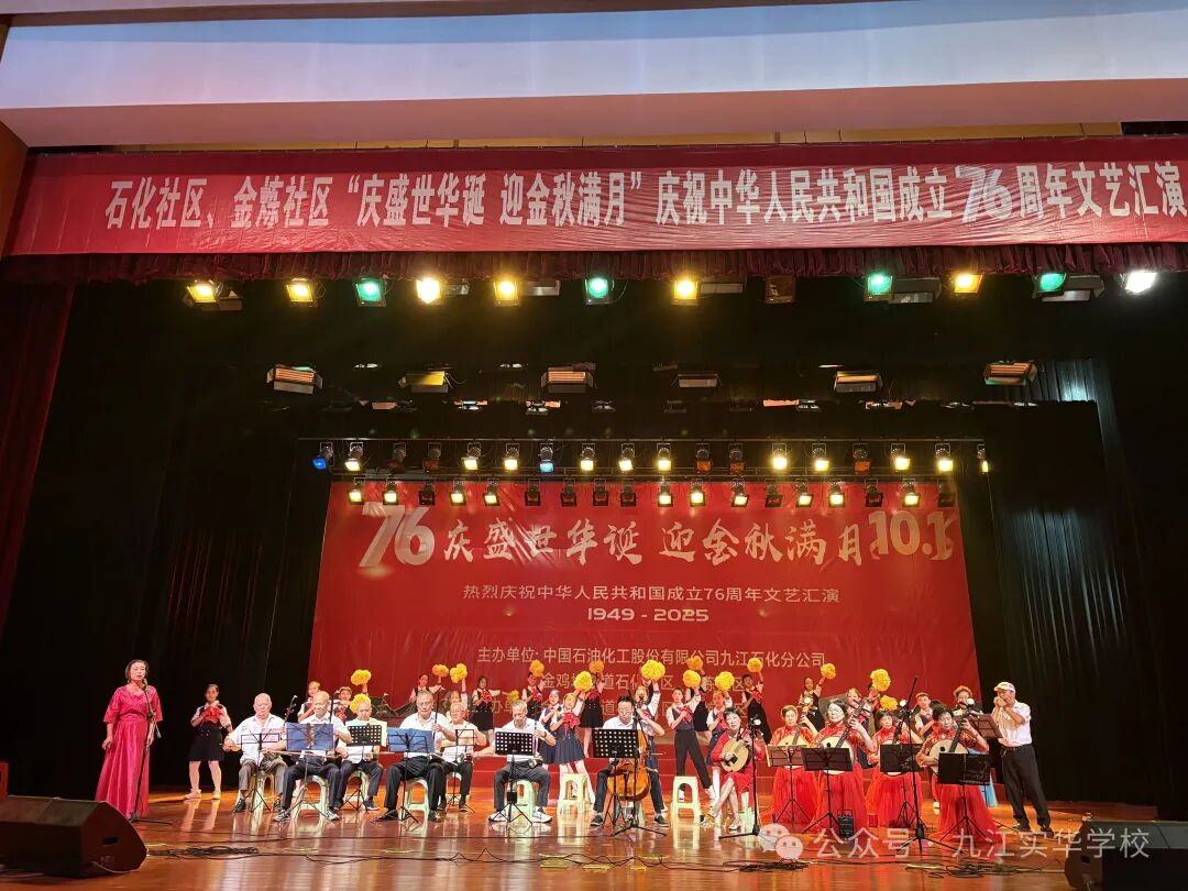 活动现场,九江实华学校的孩子们与石化小乐团的爷爷奶奶们开启了一场温馨的“老少同台”表演。舞台上,爷爷奶奶们娴熟地拉奏乐器、深情歌唱,孩子们身着靓丽服装,以灵动的舞姿为伴,共同演绎了《喜洋洋》与《我爱你中国》等经典曲目。欢快的旋律、优美的舞步与饱含深情的歌声交织,不仅展现了老少两代人对祖国的热爱,更传递出邻里和谐、共庆佳节的美好氛围,赢得了现场观众的阵阵掌声。
