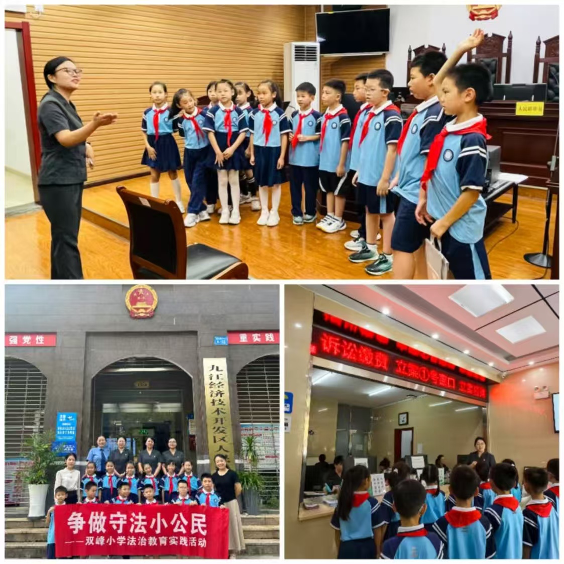 九江新闻网讯(汤佳心)为进一步加强青少年法治教育,引导学生树立法治观念、增强法律意识,9月29日下午,九江八里湖双峰小学学生代表在副校长吴颖和周淑婷老师的带领下,走进九江经济技术开发区人民法院,开展了以“走进法院学知识 争做守法小公民”为主题的法治教育实践活动,通过沉浸式体验为同学们上了一堂生动的法治启蒙课。