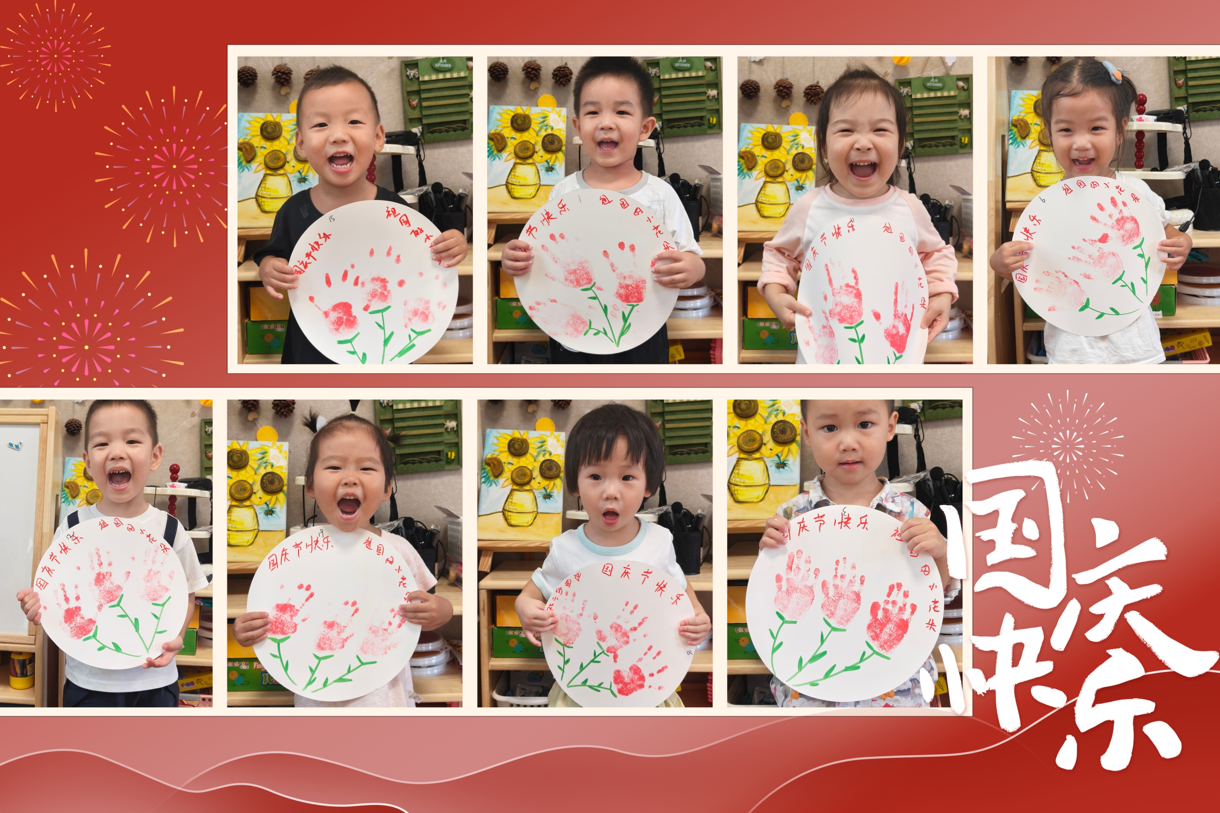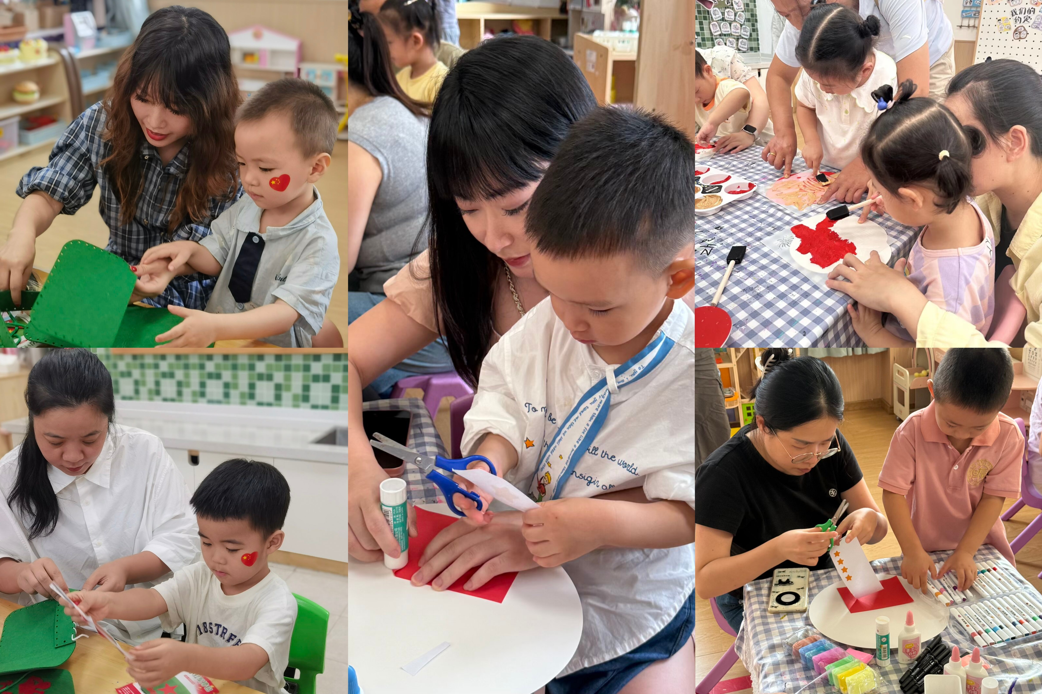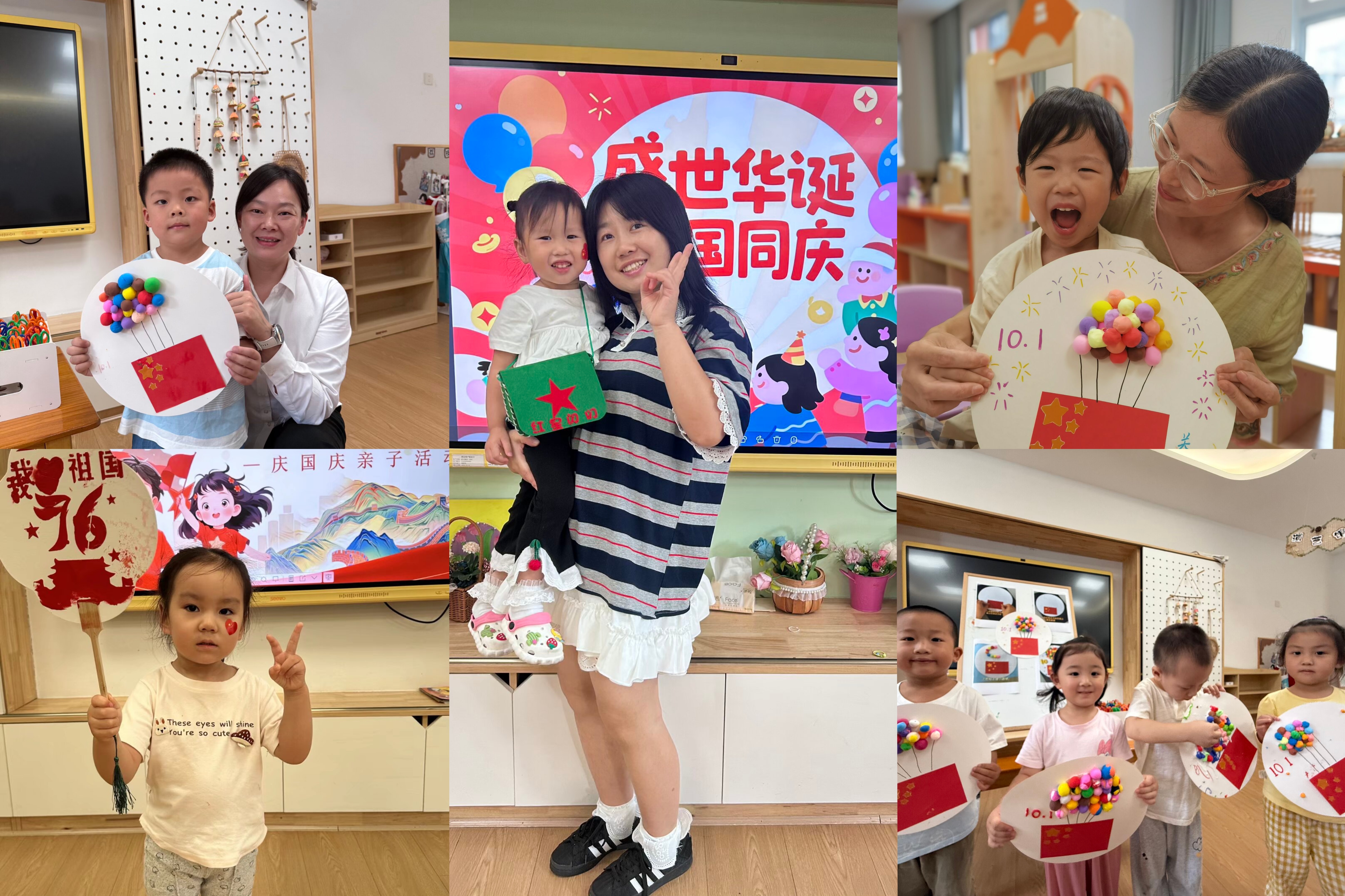 小班将亲子温情与节日祝福相融,开展庆国庆亲子DIY手工活动。现场彩纸、黏土、彩带铺满桌面,家长与孩子默契配合,指尖流转间创意绽放,既锻炼孩子动手能力,更让亲子时光浸润爱国氛围,定格温暖记忆。