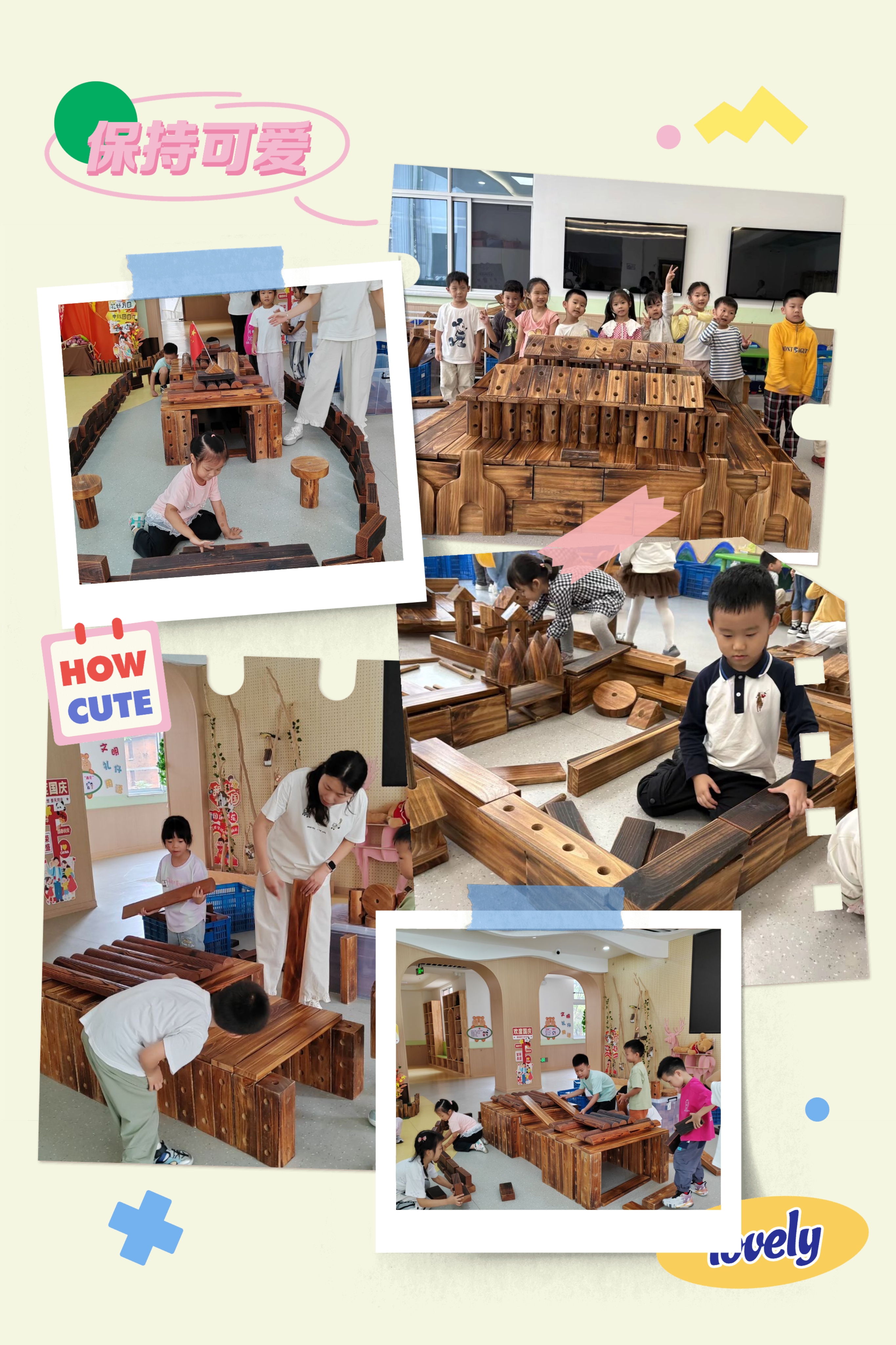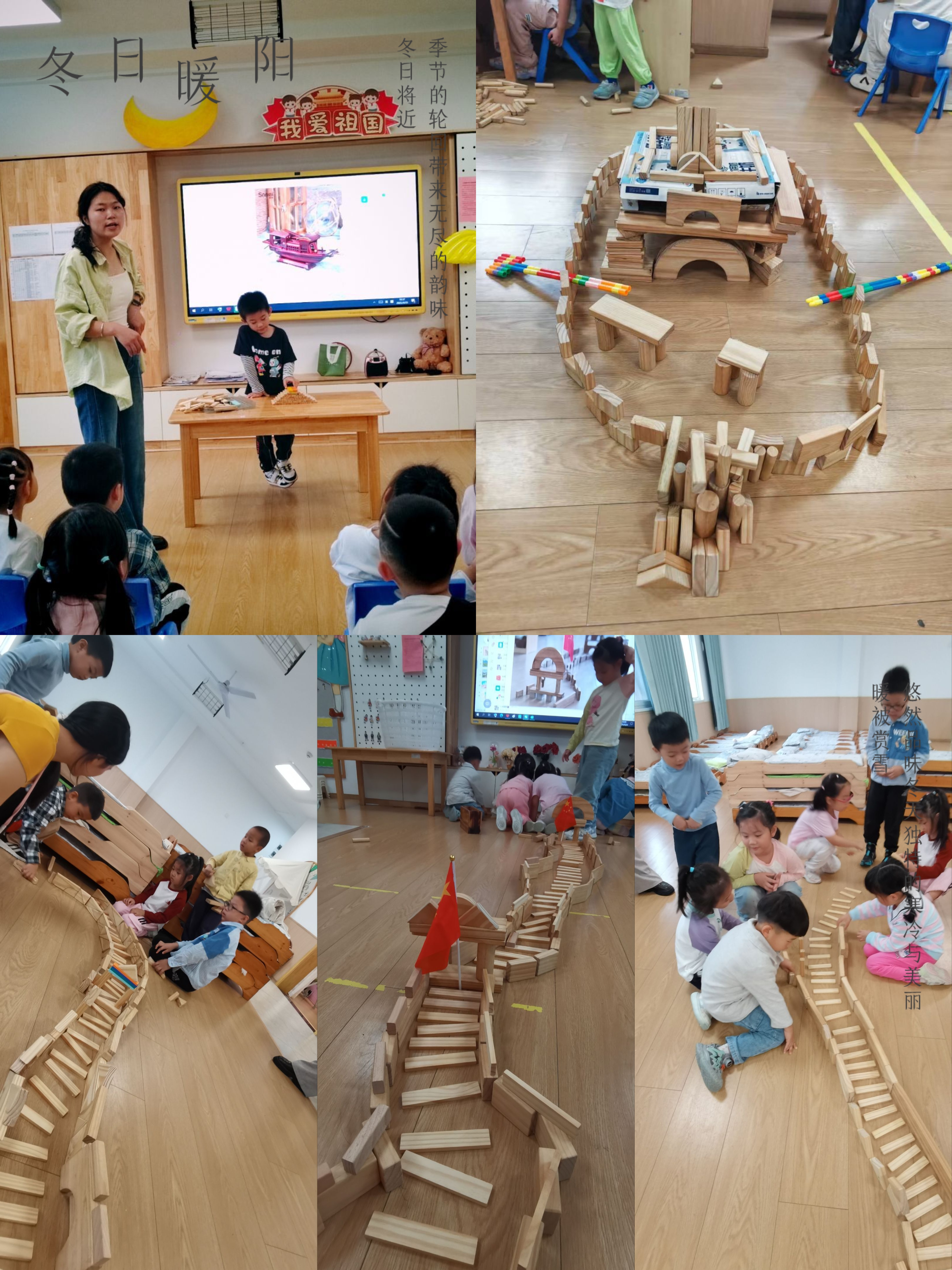 大班的哥哥姐姐则化身“小小建筑师”,围绕《我爱北京天安门》《万里长城》《南湖红船》《神舟号》四大主题,开展沉浸式自主建构活动。孩子们分组讨论、分工协作:设计搭建图纸、搬运积木材料、调整细节造型。孩子们在亲手搭建中,直观感受祖国雄伟壮阔与科技力量,民族自豪感悄然升腾。