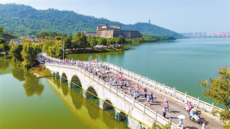 9月28日,都昌县在鄱阳湖南山公园举行百企同行、千人徒步活动,近千名运动爱好者在徒步中赏鄱阳湖美景,以运动传递健康能量,喜迎国庆。