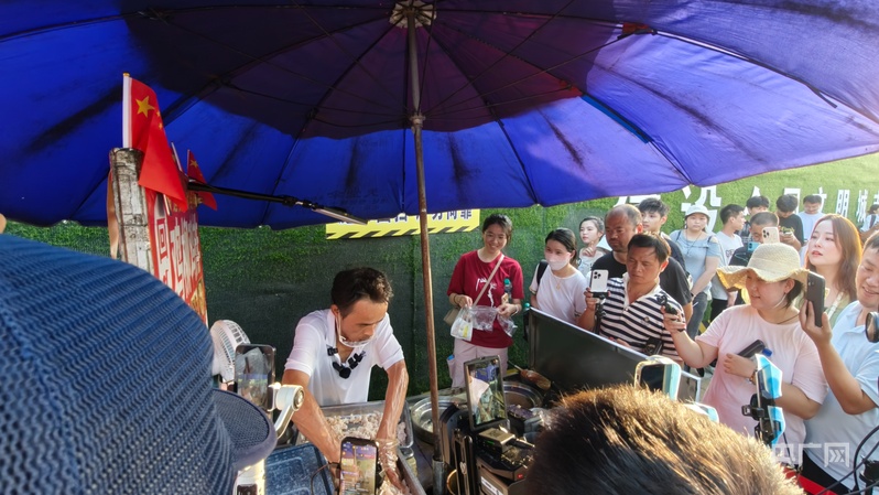 “鸡排哥”摊位前人头攒动,围满了前来打卡的游客(央广网记者胡斐 摄)