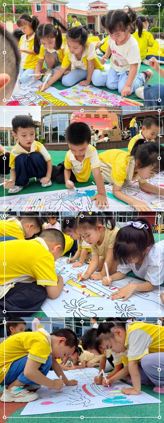 中班组的“百米画卷”活动格外热闹,孩子们共同铺开“百米画卷”,以蓝天为幕、大地为纸,将对祖国的热爱绘制成绚丽图景,共同完成了一幅充满童趣的爱国长卷。