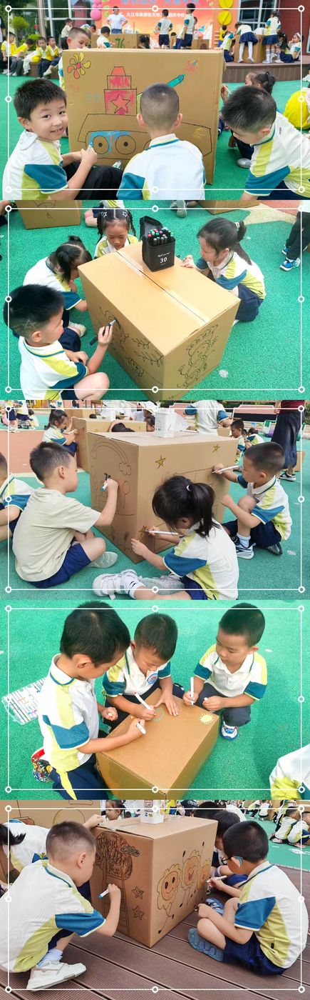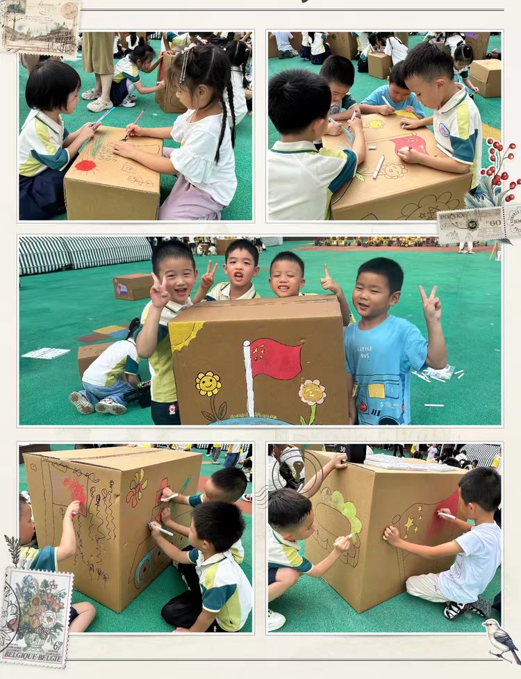 大班组则在纸箱上创作爱国主题画作,生日蛋糕、宇宙飞船、天安门等画得栩栩如生,既锻炼动手能力,又传递了爱国情感。